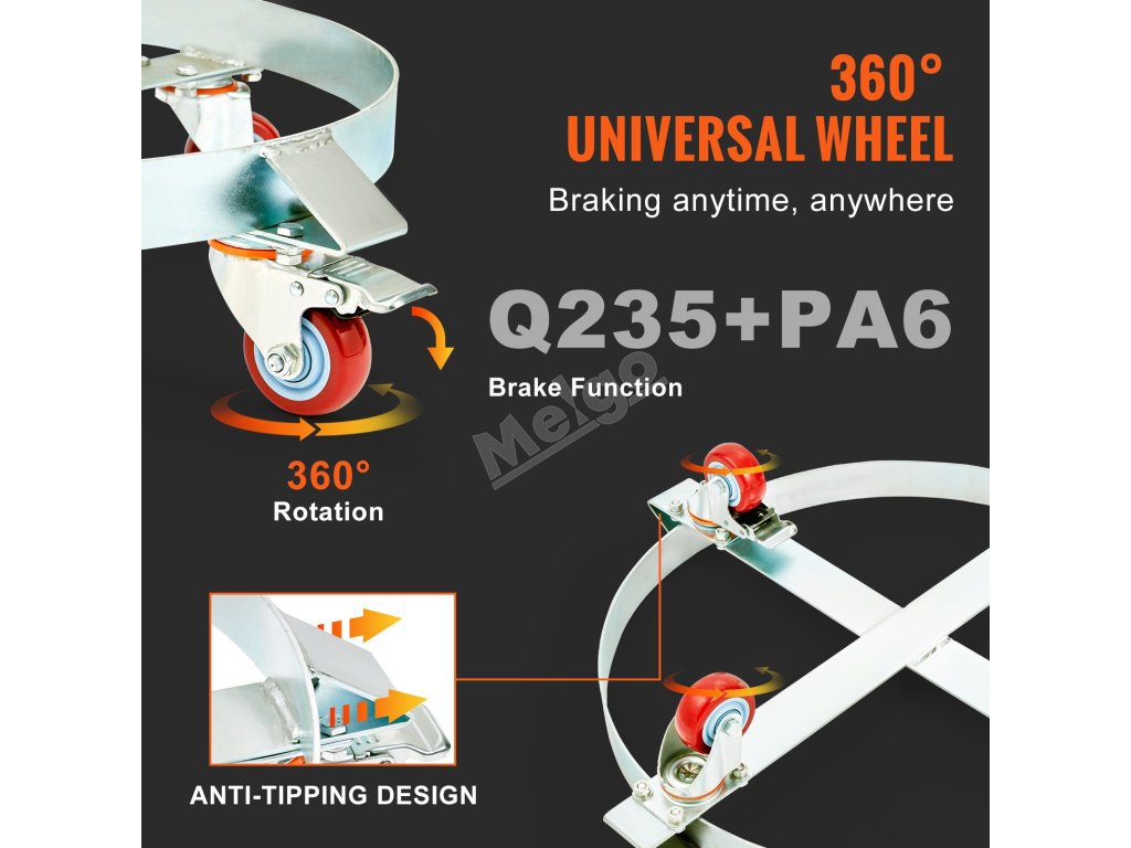 Vozík na sudy VEVOR má maximální nosnost 1 000 liber a zvládne převážet sudy o objemu až 55 galonů. Univerzální kola s brzdami usnadňují uživateli ovládání směru jízdy. Vyberte si vozík na sudy VEVOR, se kterým bude manipulace se sudy hračka!
