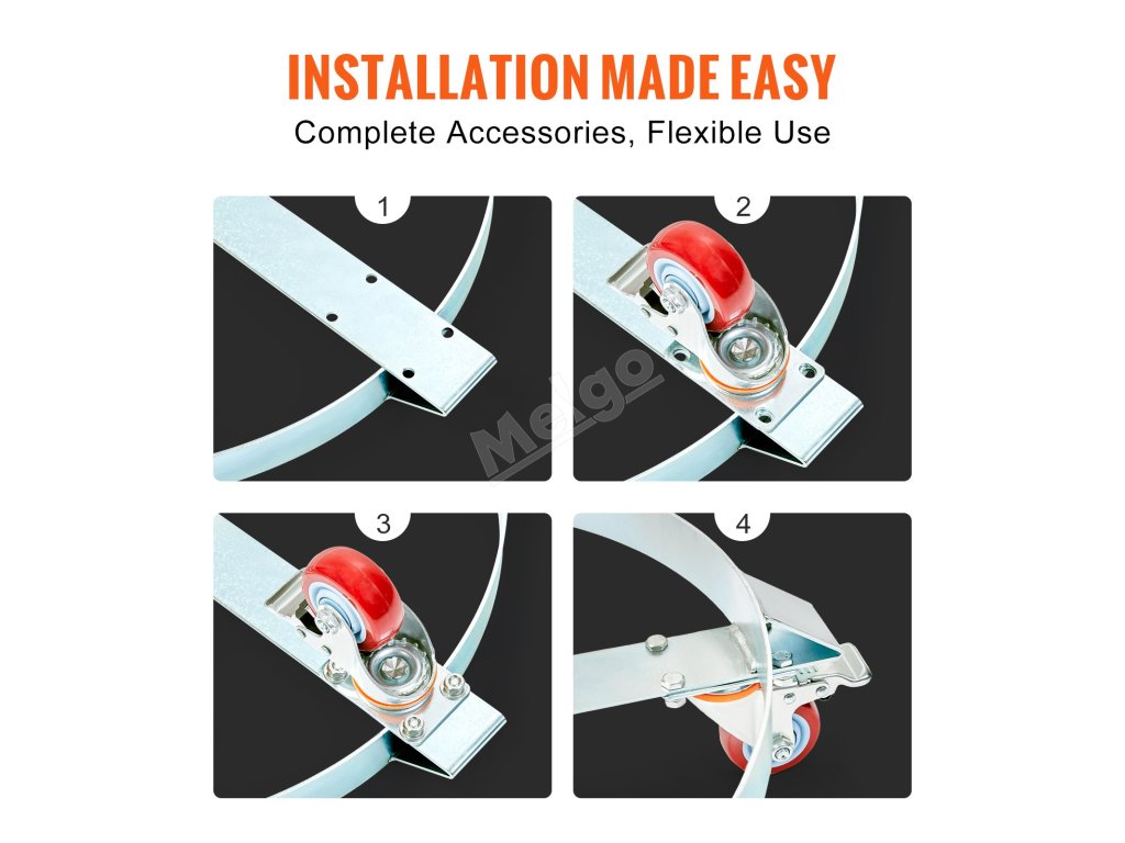Vysoce odolný vozík na sudy je vyroben z uhlíkové oceli o tloušťce 0,14 palce/3,5 mm, která zaručuje vysokou odolnost. Pozinkovaná povrchová úprava odolává korozi a rzi, což prodlužuje jeho životnost.