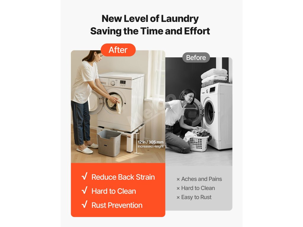 Tento stojan na pračku zvedá spotřebič do pohodlné pracovní výšky, čímž snižuje zatížení zad a kolen při každodenním praní. Přináší větší pohodlí a péči při každodenním používání, zejména při častém vkládání a vyjímání prádla.