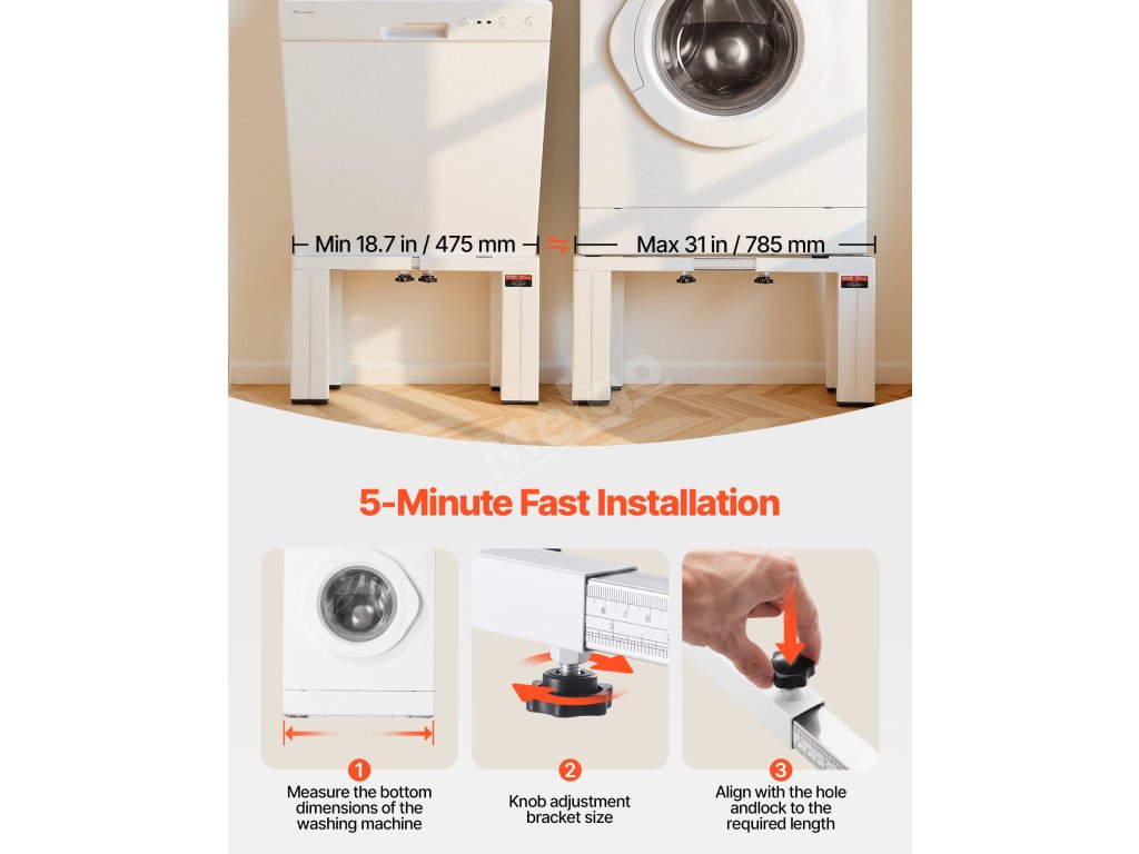 Tento univerzální stojan na pračku je pečlivě navržen tak, aby se hodil téměř ke všem pračkám a sušičkám. Ať už používáte pračku Samsung, LG, Whirlpool, GE, Miele, Electrolux nebo Bosch, stojan se bez problémů přizpůsobí a zajistí bezpečnou instalaci.