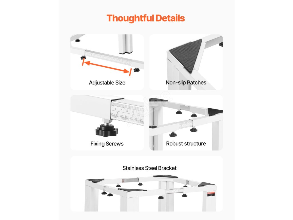 Tento stojan na pračku a sušičku je vyroben z vysoce kvalitní oceli a je vhodný pro domácí použití. Zesílený rám unese velké zatížení, aniž by se ohnul, a pomáhá tak udržet dlouhodobou stabilitu a spolehlivý výkon.