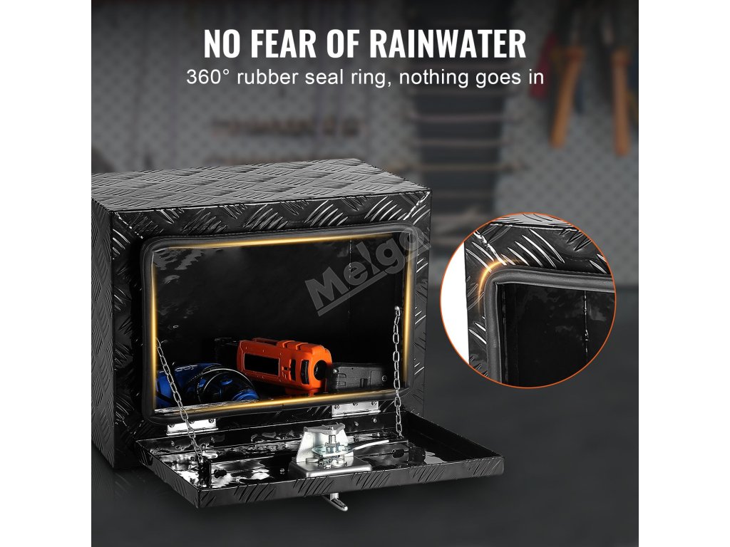 Vyrobeno ze zesíleného materiálu z hliníkové slitiny s povrchovým vzorem odolným proti poškrábání, který účinně zvyšuje odolnost a tvrdost; vybaveno 360° gumovým těsnicím proužkem uvnitř boxu na nářadí, který udržuje předměty v suchu a zabraňuje korozi a rzi.