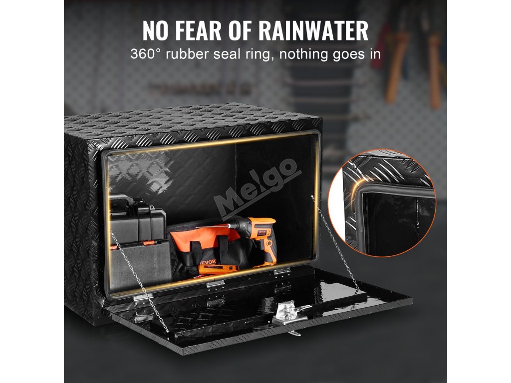 Vyrobeno ze zesíleného materiálu z hliníkové slitiny s povrchovým vzorem odolným proti poškrábání, který účinně zvyšuje odolnost a tvrdost; vybaveno 360° gumovým těsnicím proužkem uvnitř boxu na nářadí, který udržuje předměty v suchu a zabraňuje korozi a rzi.