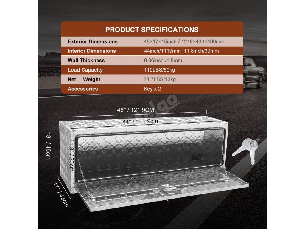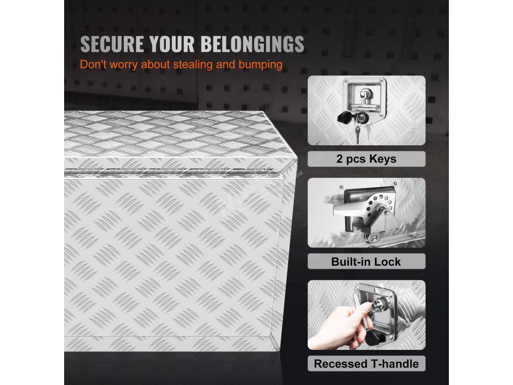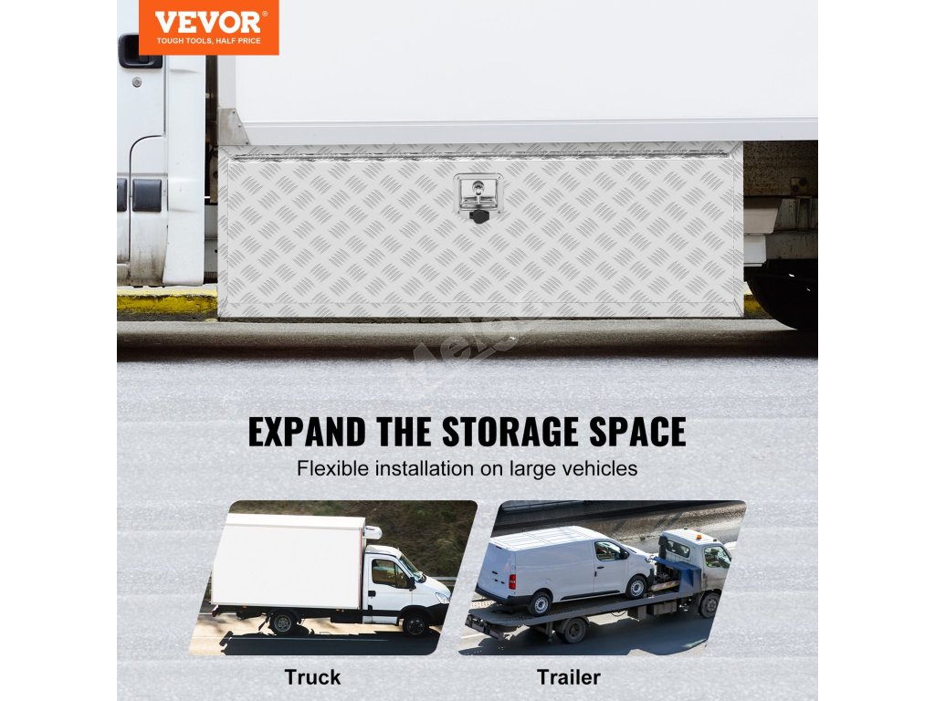 Podvozkový box VEVOR je ideálny pre potreby skladovania ťažkých nákladov. Jeho pevná hliníková konštrukcia zaručuje odolnosť. Rozmery 48 x 17 x 18 palcov poskytujú dostatok priestoru na náradie a vybavenie. Nosnosť 110 libier poskytuje dostatok priestoru na prepravu rôznych predmetov. Tento podvozkový box pre nákladné vozidlá ponúka bezpečné a zároveň spoľahlivé riešenie na skladovanie na profesionálne aj osobné použitie. Môžete s ním jednoducho manipulovať a inštalovať ho. Vďaka svojej konštrukcii sa pohodlne zmestí pod nákladné vozidlá, dodávky a prívesy. Preto má náš box hliníkový diamantový plech, ktorý mu dodáva pevnosť a estetický vzhľad, takže je ideálny pre každého, kto potrebuje bezpečný a dostupný úložný priestor. Podelili sme sa aj o niekoľko pôsobivých vlastností, vďaka ktorým je náš box na podvozok nákladného vozidla spoľahlivou voľbou pre požiadavky na vysokokvalitné skladovanie. Vďaka jeho jedinečnému dizajnu a konštrukcii sa môžete spoľahnúť, že udrží vaše predmety v bezpečí.