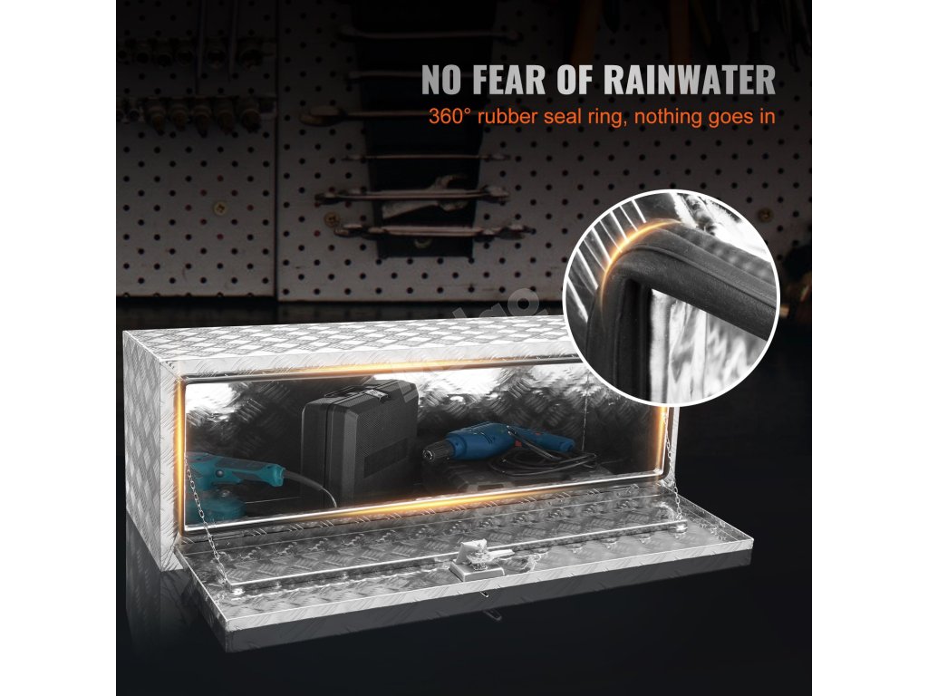 Podvozkový box VEVOR pre nákladné vozidlá poskytuje vynikajúcu ochranu pred poveternostnými vplyvmi. Jeho vodotesná konštrukcia zaručuje, že vaše predmety zostanú v suchu a bezpečí. Box je ideálny pre prívesy a nákladné vozidlá vystavené nepriaznivému počasiu. Hliníková konštrukcia poskytuje bariéru proti vlhkosti a dažďu. Vďaka tomu sú vaše náradie a vybavenie dobre chránené. Vodotesné vlastnosti sú pri vonkajšom skladovaní nevyhnutné. Môžete tak zabrániť korózii a hrdzi, pretože do boxu sa nedostane žiadna voda. Predlžuje sa tak životnosť vašich výrobkov. Tesniaci mechanizmus zabezpečuje, že sa dovnútra nedostane žiadna voda. Preto je ideálny aj na dlhodobé skladovanie. Prečo by ste si mali vybrať podvozkový box VEVOR pre nákladné vozidlá? Box je navrhnutý tak, aby vaše veci boli v bezpečí. Jeho vodotesná funkcia dodáva ďalšiu vrstvu ochrany. Preto získate spoľahlivú voľbu pre potreby vonkajšieho skladovania.