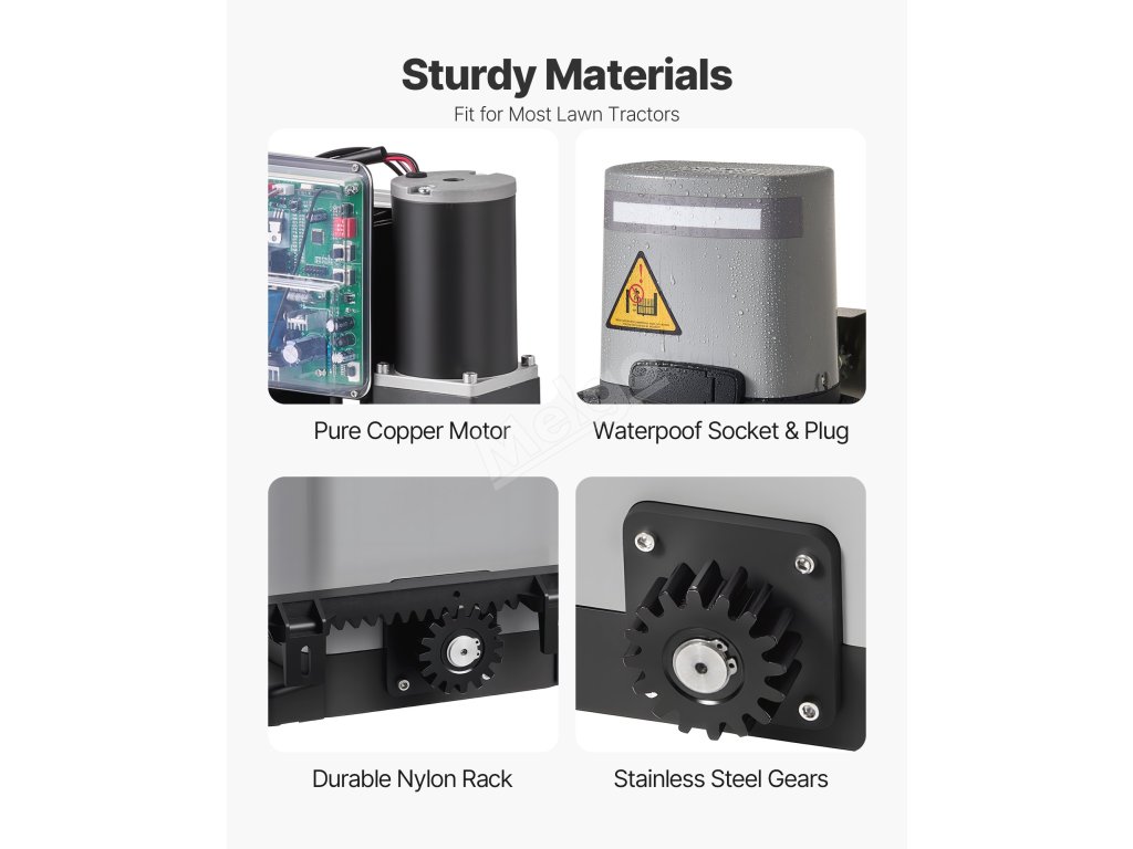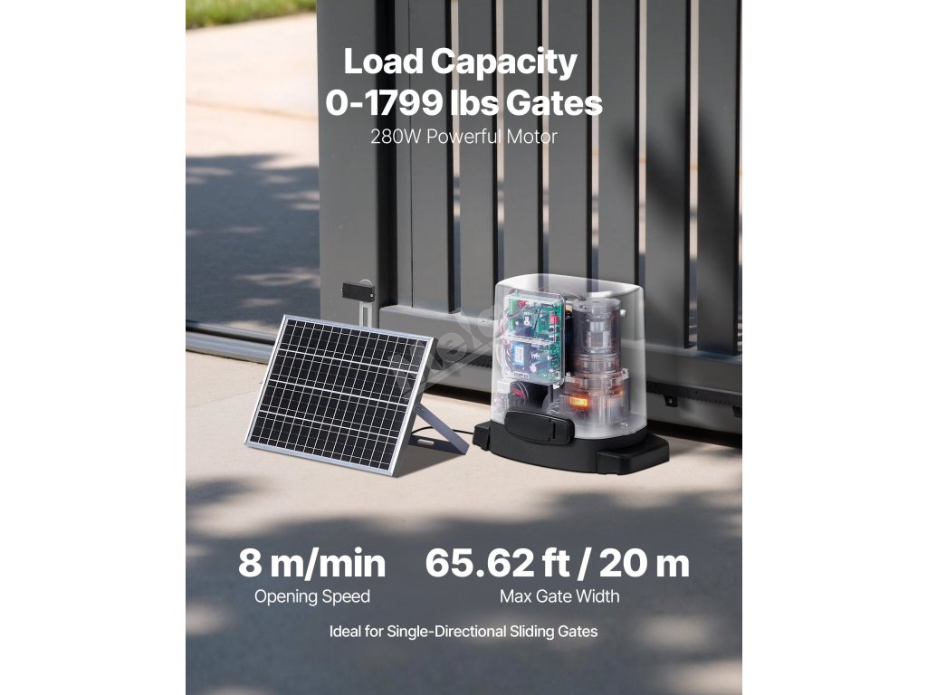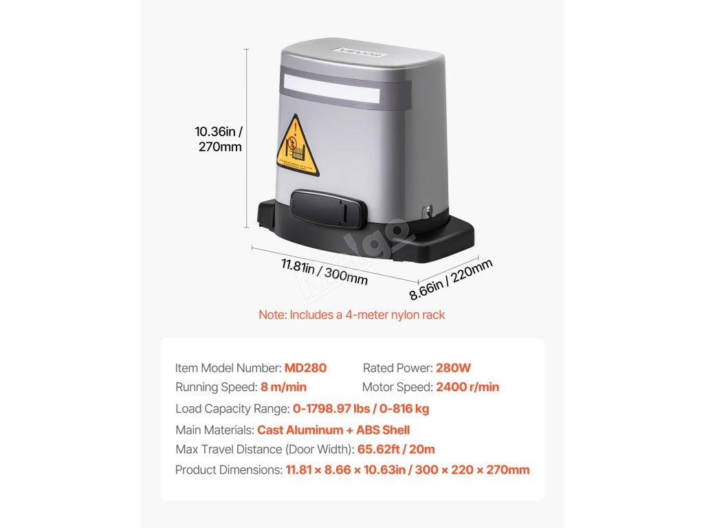 Tento otvírač bran je vybaven výkonným 280W motorem, který si poradí s branami o šířce až 65,62 ft/20 m a hmotnosti 1799 lbs/816 kg, přičemž nabízí plynulý a rychlý provoz (10 m/min), který šetří čas. Díky infračervené technologii automatického rozpoznávání brány zabraňuje kolizím, čímž zajišťuje bezpečnost vaší rodiny a domácích mazlíčků.