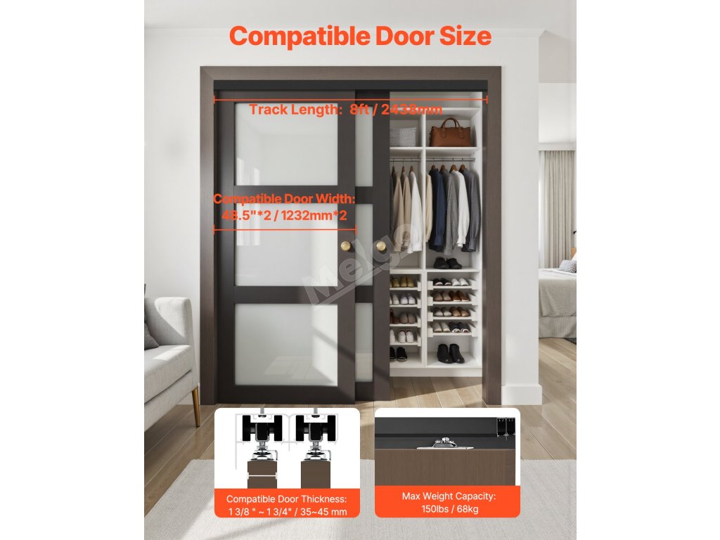 Pojezdová sada na odsuvné dveře 8ft, pro 2 dveře, tloušťka 1 3/8"–1 3/4"