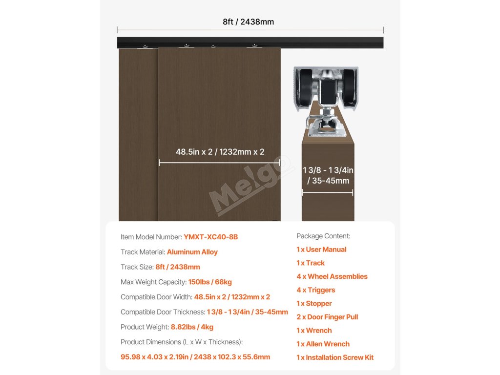 Tato 8 stop dlouhá sada obtokového dveřního kování je vhodná pro dveřní výplně o tloušťce 1 3/8" až 1 3/4" a šířce 48,5" x 2". Udrží maximální hmotnost 150 liber, takže si můžete vybrat správnou velikost podle svých potřeb.