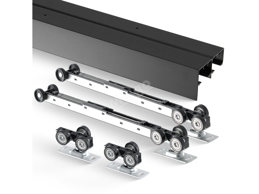 Závěsy této kolejnice pro šatní dveře mají tříkolovou konstrukci s těžkými kuličkovými ložisky, která zajišťují rovnoměrné rozložení hmotnosti. Díky tomu se dveře hladce posouvají, což snižuje hlučnost a zajišťuje stabilní provoz.