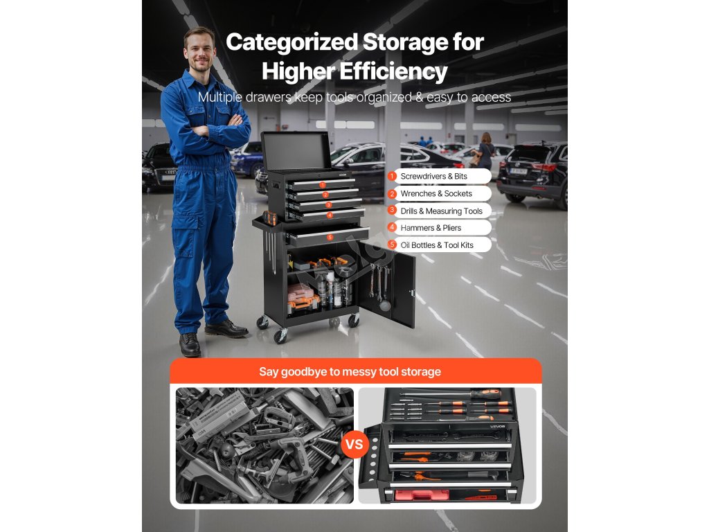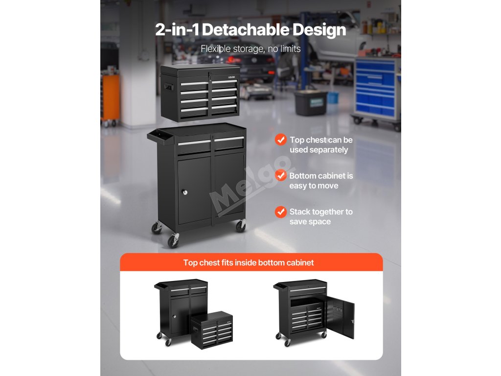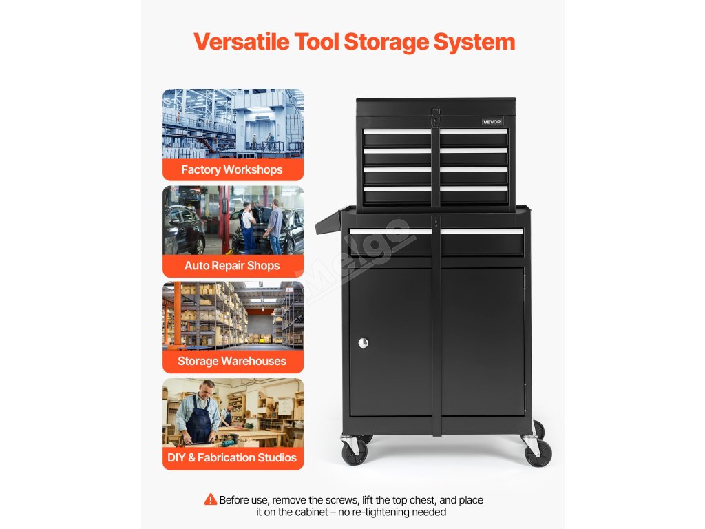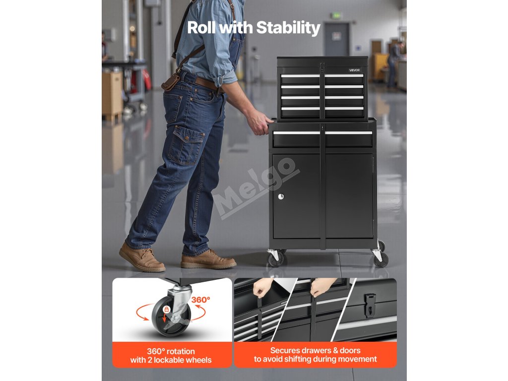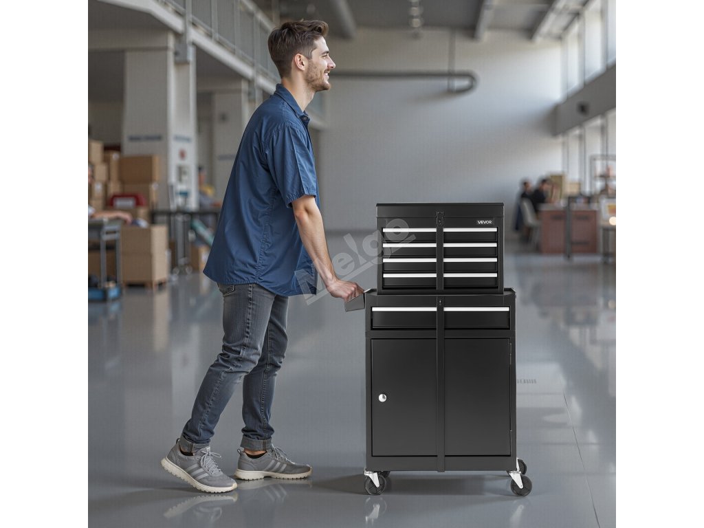 Tuto pojízdnou skříňku na nářadí lze rozložit na čtyřzásuvkovou skříňku na nářadí a pojízdnou skříňku. Kombinace horní přihrádky, zásuvkového boxu, spodní skříňky s kolečky a bočního stojanu na nářadí je navržena tak, aby poskytovala dostatek úložného prostoru pro různé nářadí a pohodlný přístup pro vás.