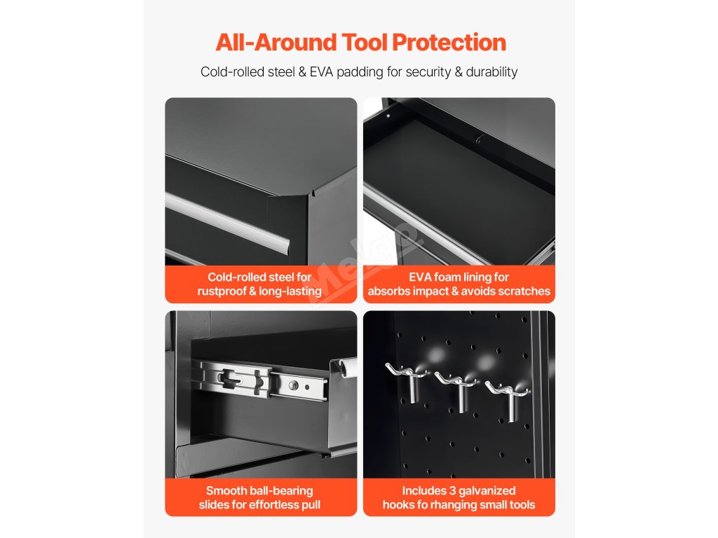 Náš stojan na nářadí je vyroben z odolné oceli válcované za studena s práškovou povrchovou úpravou a odolává korozi, rzi a opotřebení. Zabudované polstrování EVA v pracovním stole a zásuvkách dokáže izolovat teplo a tlumit nářadí, čímž zabraňuje vibracím a hluku a prodlužuje životnost vašeho nářadí a boxu na nářadí.