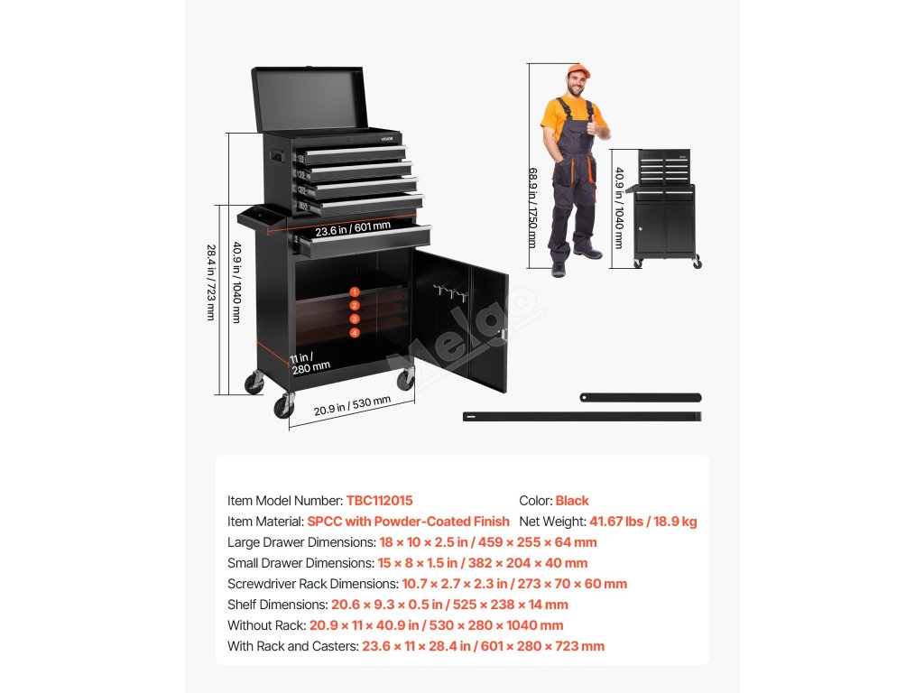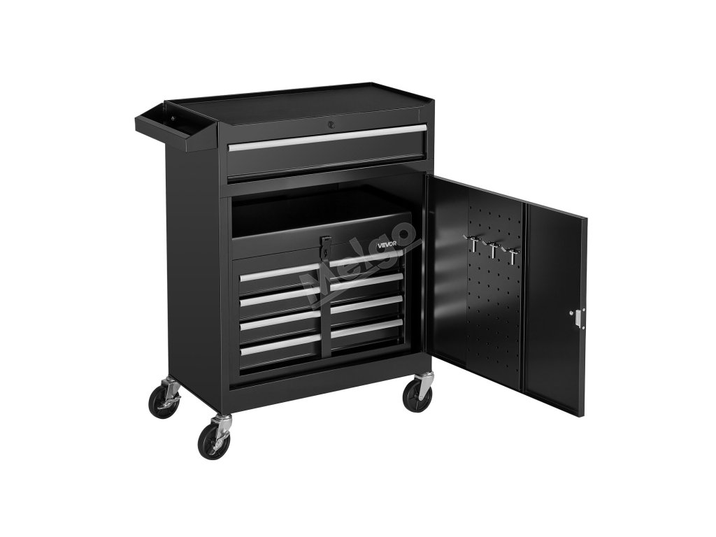Tato pojízdná skříň na nářadí se zásuvkami je ideální pro organizaci nářadí v továrních dílnách, pro ukládání a přepravu vybavení v garážích a pro umístění velkého nářadí ve skladech nebo garážích. Dodává se již smontovaná - pro rychlé sestavení stačí připojit kolečka, stojan na šroubováky a madla dveří.