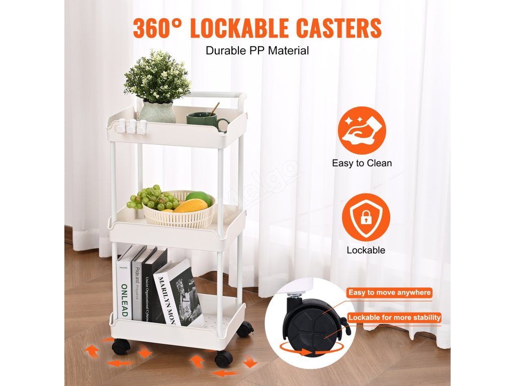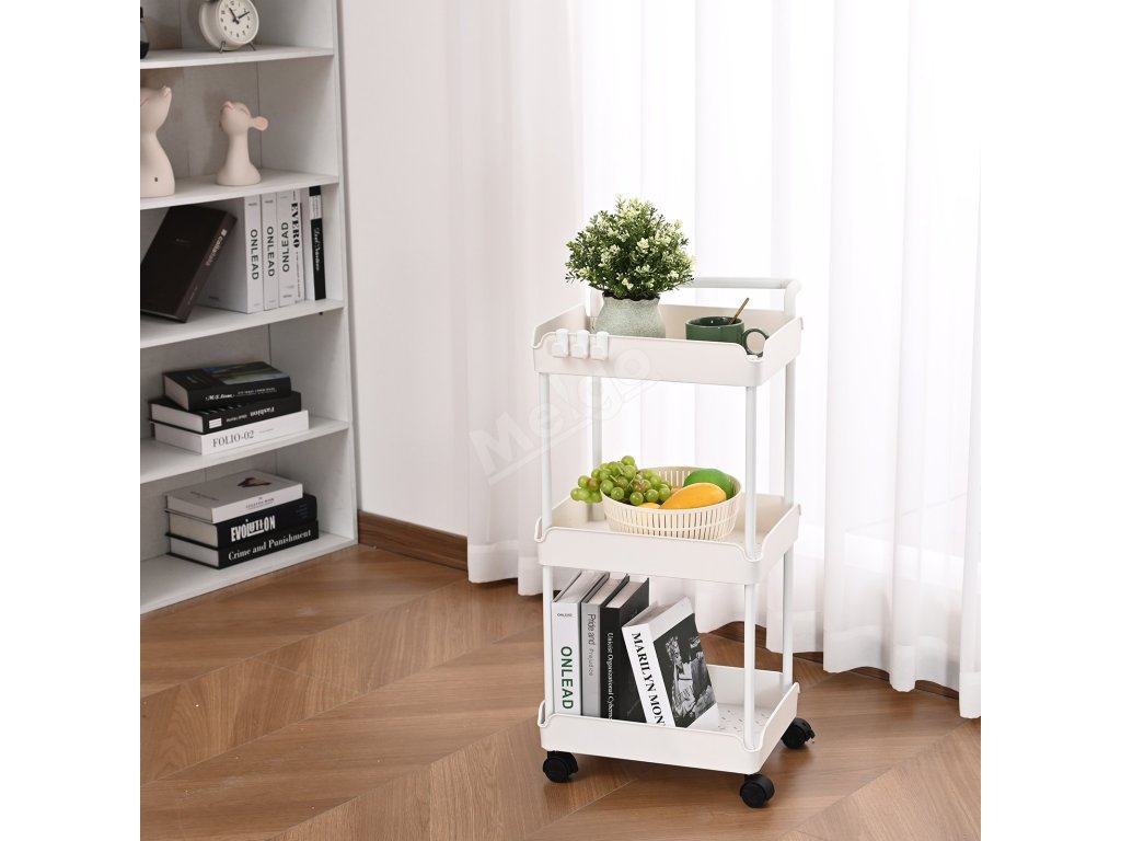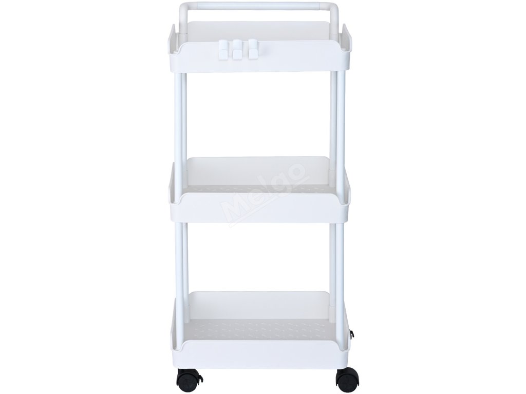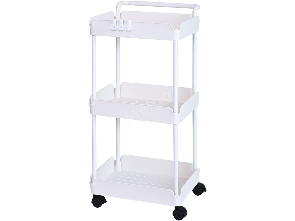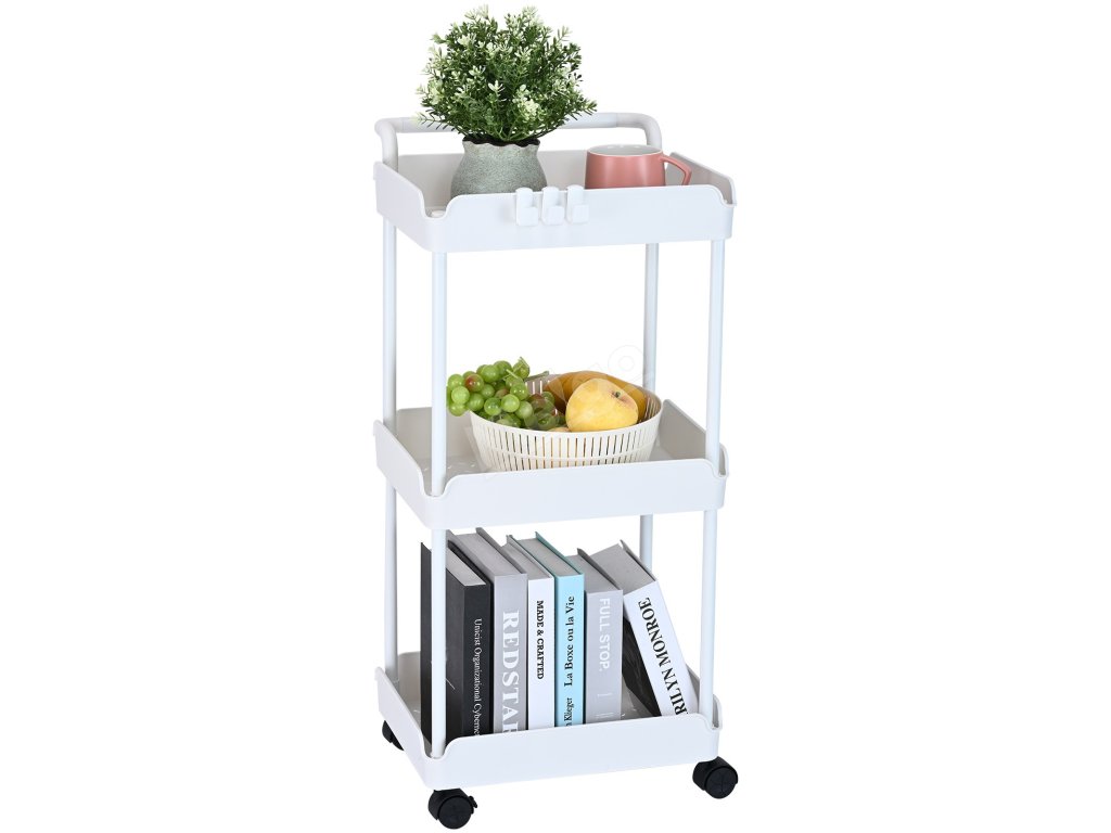 Pojízdný 3-patrový vozík s úchytem a uzamykacími kolečky, bílý