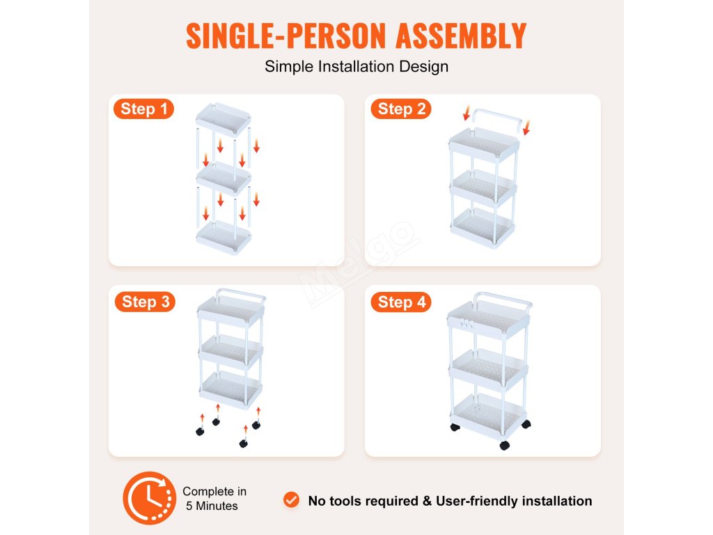 Tento pojízdný vozík nevyžaduje k montáži žádné nářadí - stačí vám jen ruce, takže se nemusíte obtěžovat s hledáním a používáním nářadí. Proces sestavení je rychlý a snadný, což vám ušetří čas a námahu!