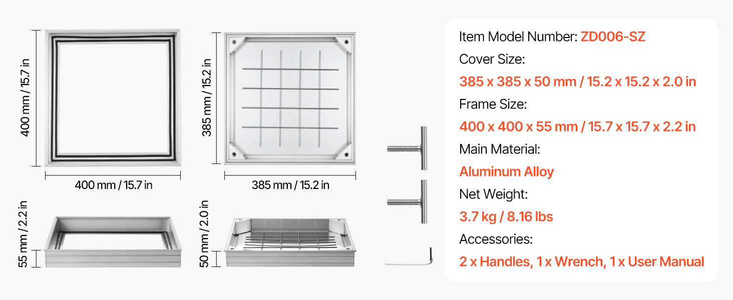 Tento čtvercový poklop je vyroben z hliníkové slitiny s eloxovanou povrchovou úpravou, je odolný proti korozi, korozi a opotřebení a poskytuje spolehlivý výkon a trvanlivost.