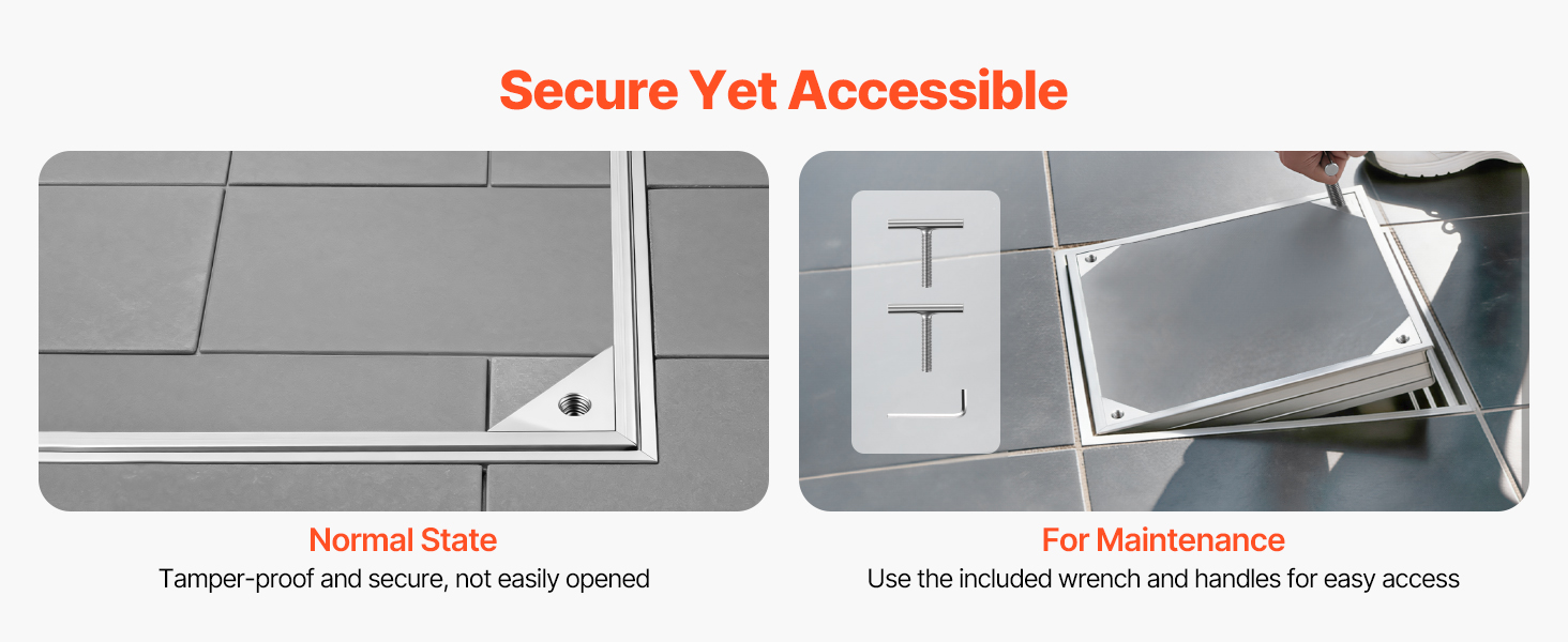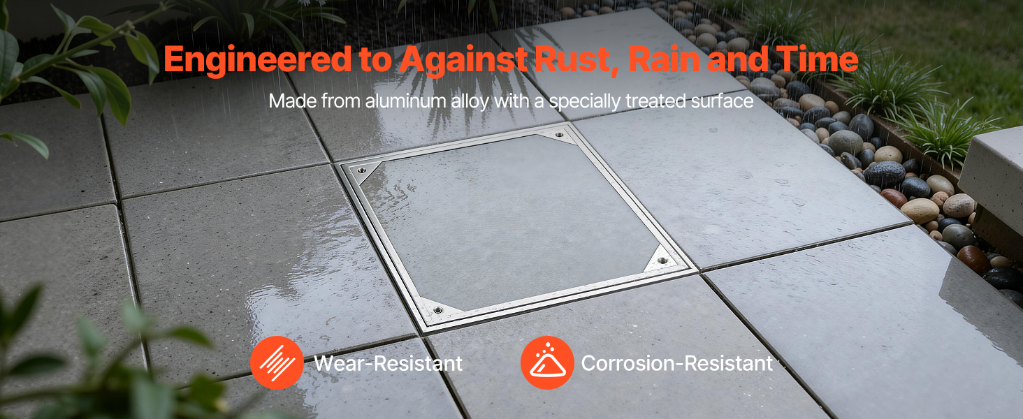 Neviditelná zapuštěná konstrukce je ideální pro terasy, vnitřní podlahy a chodníky a je v jedné rovině s okolními povrchy, takže přístup ke kontrole je pohodlný a čistý.