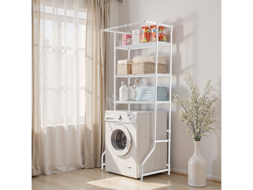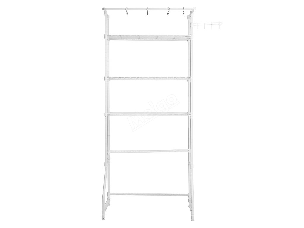 Tento úložný regál na pračku a sušičku kombinuje závěsnou tyč, nastavitelné police a otočné háčky, aby vyhověl různým úložným potřebám.