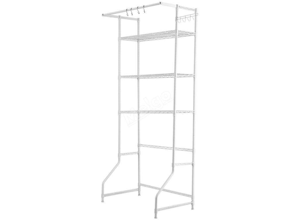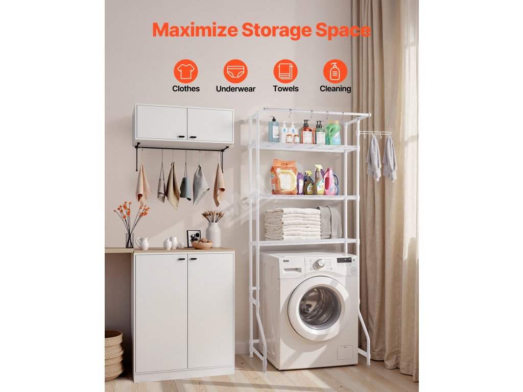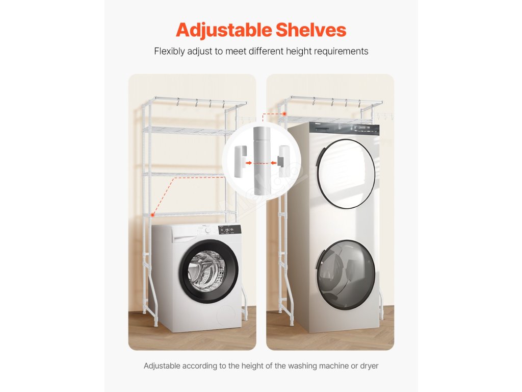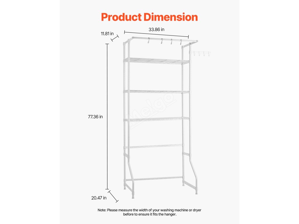 Tento úložný regál nad pračku a sušičku s nastavitelnými policemi, tyčemi a háčky je vhodný pro většinu praček. Je vyroben z trvanlivé uhlíkové oceli odolné proti korozi, unese až 165,35 lbs/75 kg a je vybaven zařízením proti převrácení a snadnou instalací.