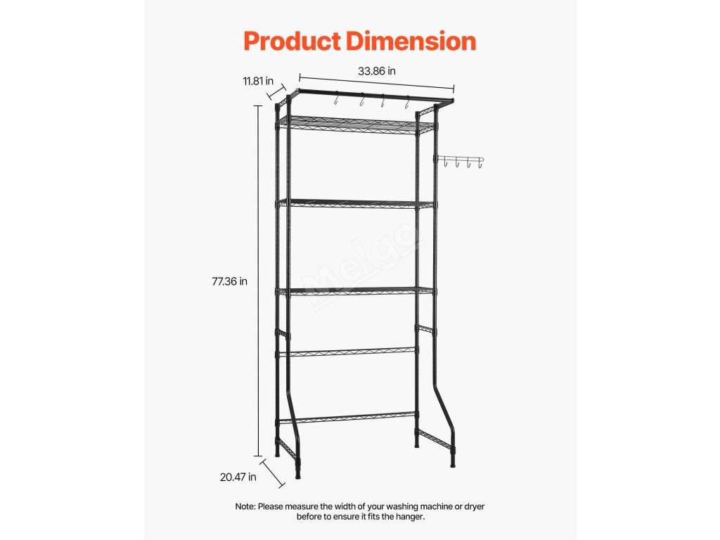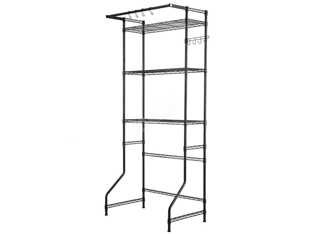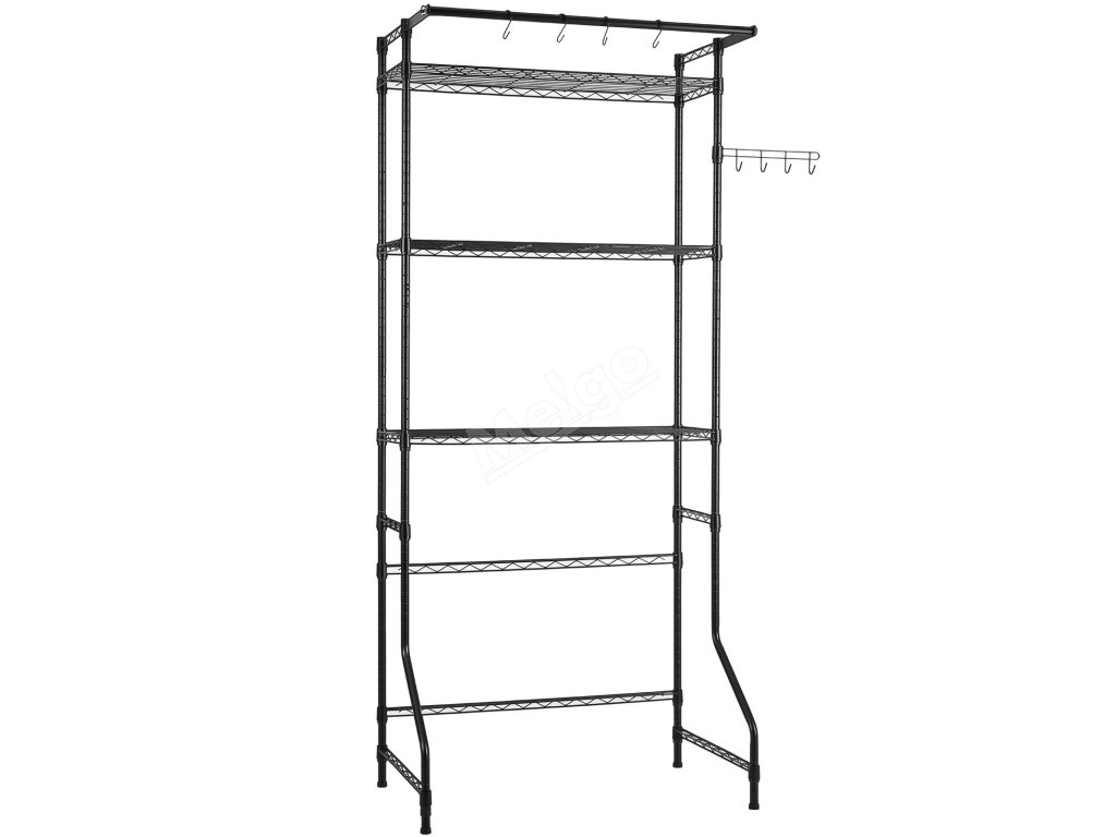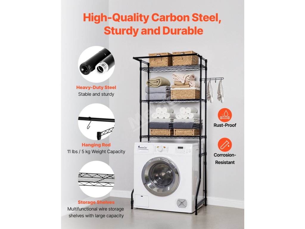 Tento úložný regál nad pračku a sušičku s nastavitelnými policemi, tyčemi a háčky je vhodný pro většinu praček. Je vyroben z trvanlivé uhlíkové oceli odolné proti korozi, unese až 165,35 lbs/75 kg a je vybaven zařízením proti převrácení a snadnou instalací.