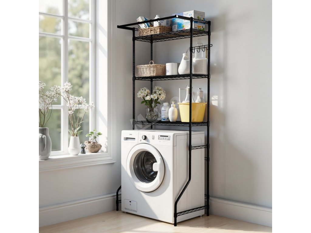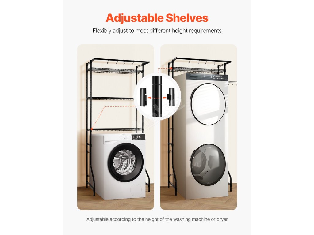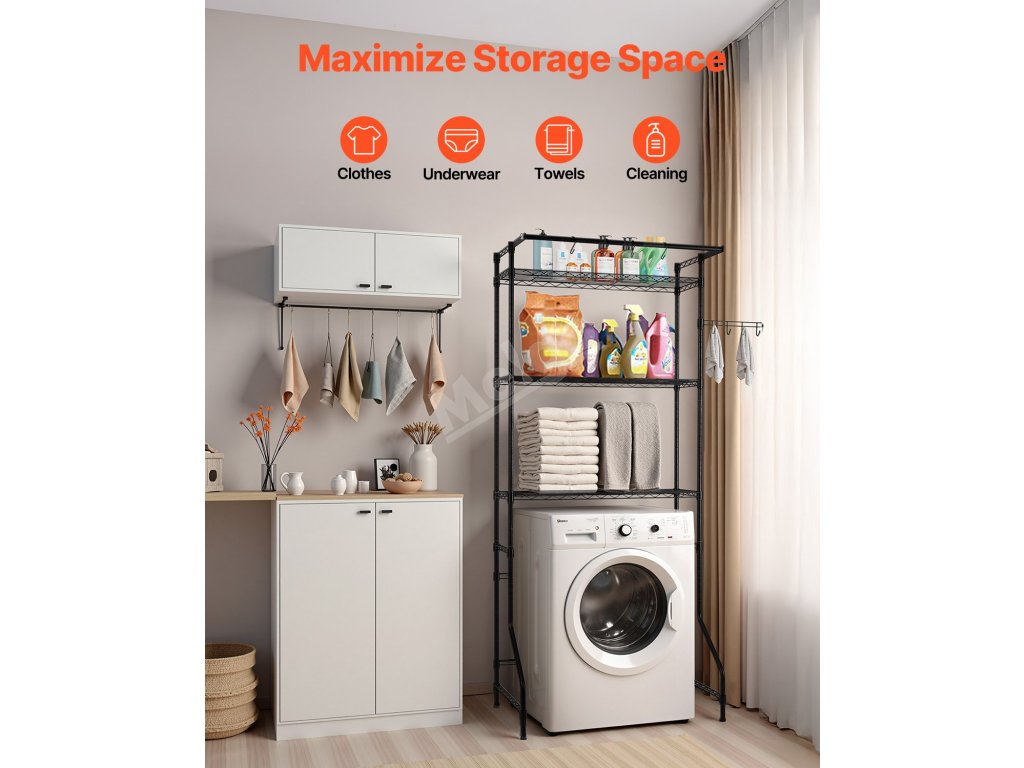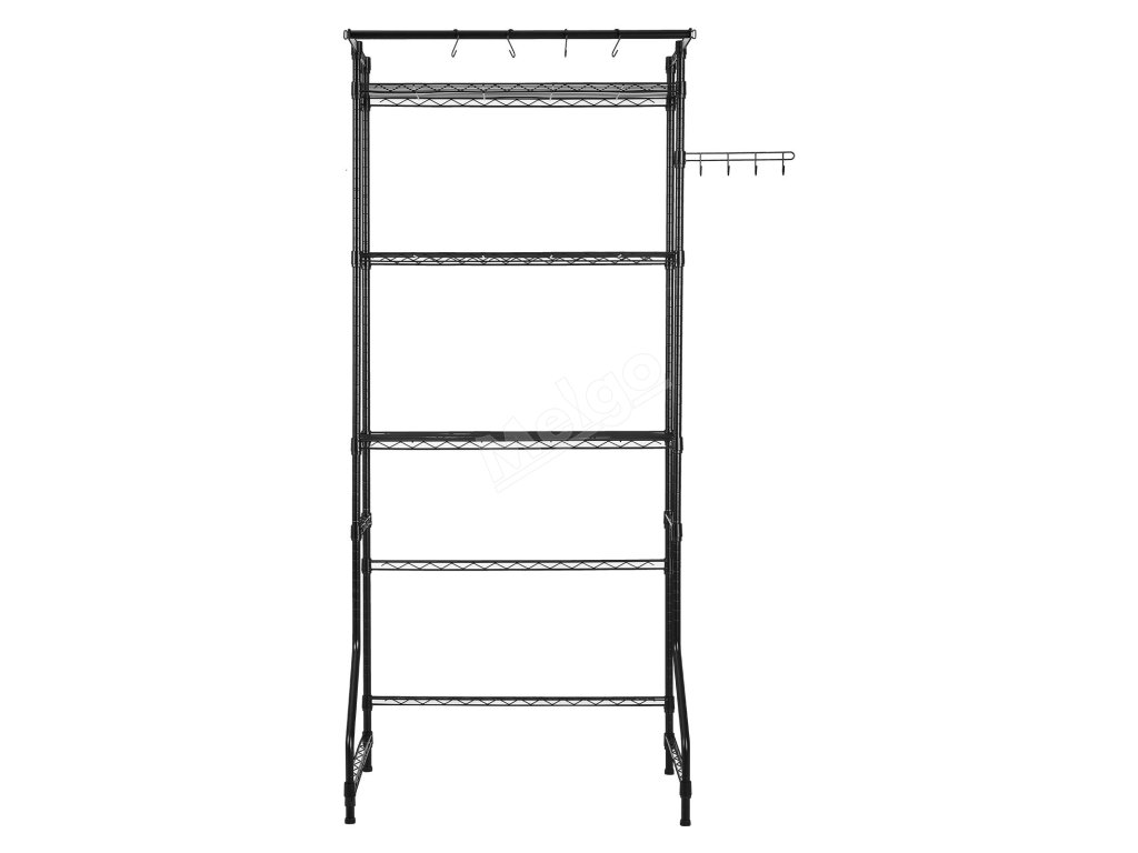 Tento úložný regál nad pračku a sušičku s nastavitelnými policemi, tyčemi a háčky je vhodný pro většinu praček. Je vyroben z trvanlivé uhlíkové oceli odolné proti korozi, unese až 165,35 lbs/75 kg a je vybaven zařízením proti převrácení a snadnou instalací.