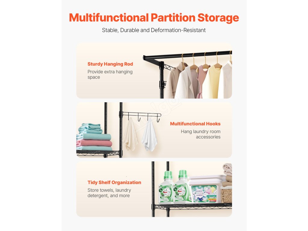 Tento úložný regál na pračku a sušičku kombinuje závěsnou tyč, nastavitelné police a otočné háčky, aby vyhověl různým úložným potřebám.