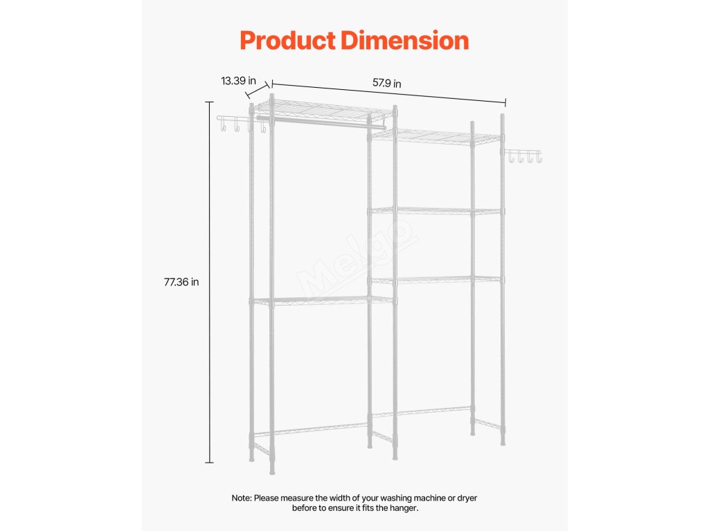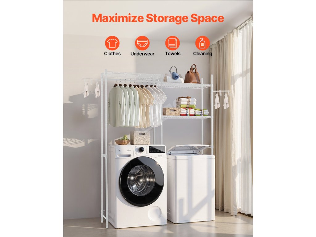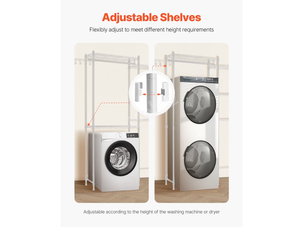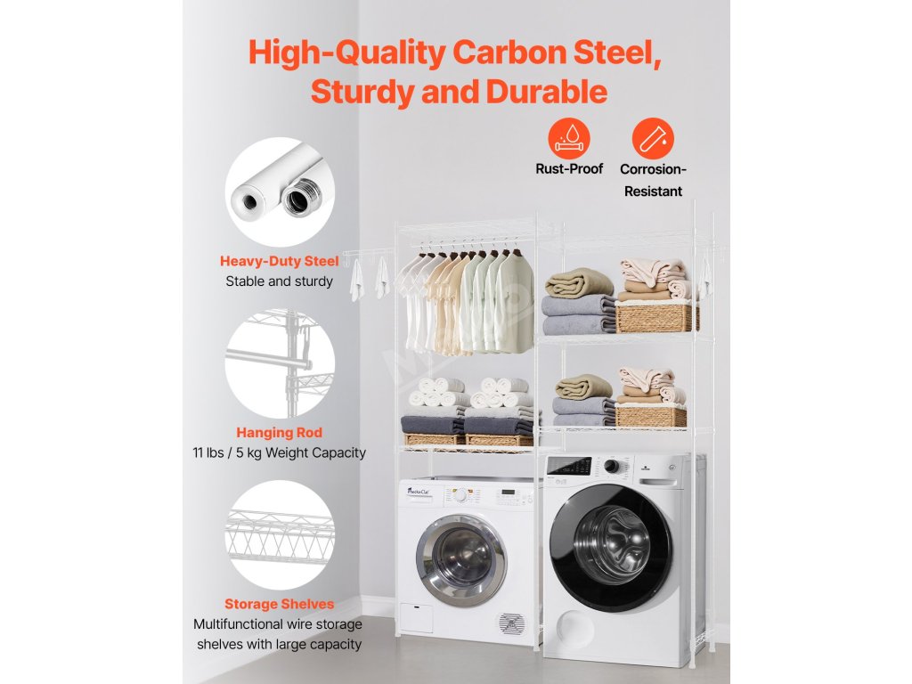 Kompaktní a odolný stojan na pračku a sušičku Tento stojan na pračku a sušičku s nastavitelnými policemi, tyčemi a háčky je vhodný pro většinu praček. Je vyroben z odolné uhlíkové oceli odolné proti korozi, unese až 275,6 lbs/125 kg a je vybaven zařízením proti převrácení a snadnou instalací.