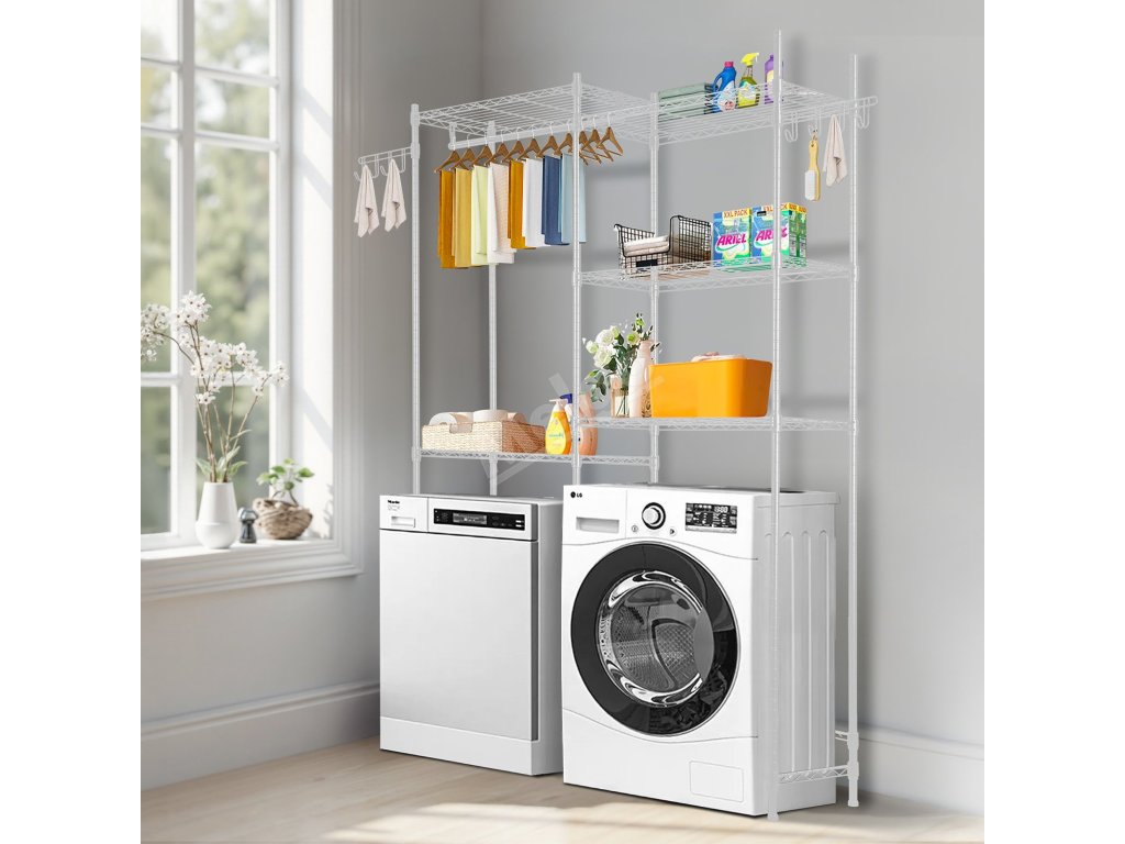Tento úložný regál na pračku a sušičku kombinuje závěsnou tyč, nastavitelné police a otočné háčky, aby vyhověl různým úložným potřebám.