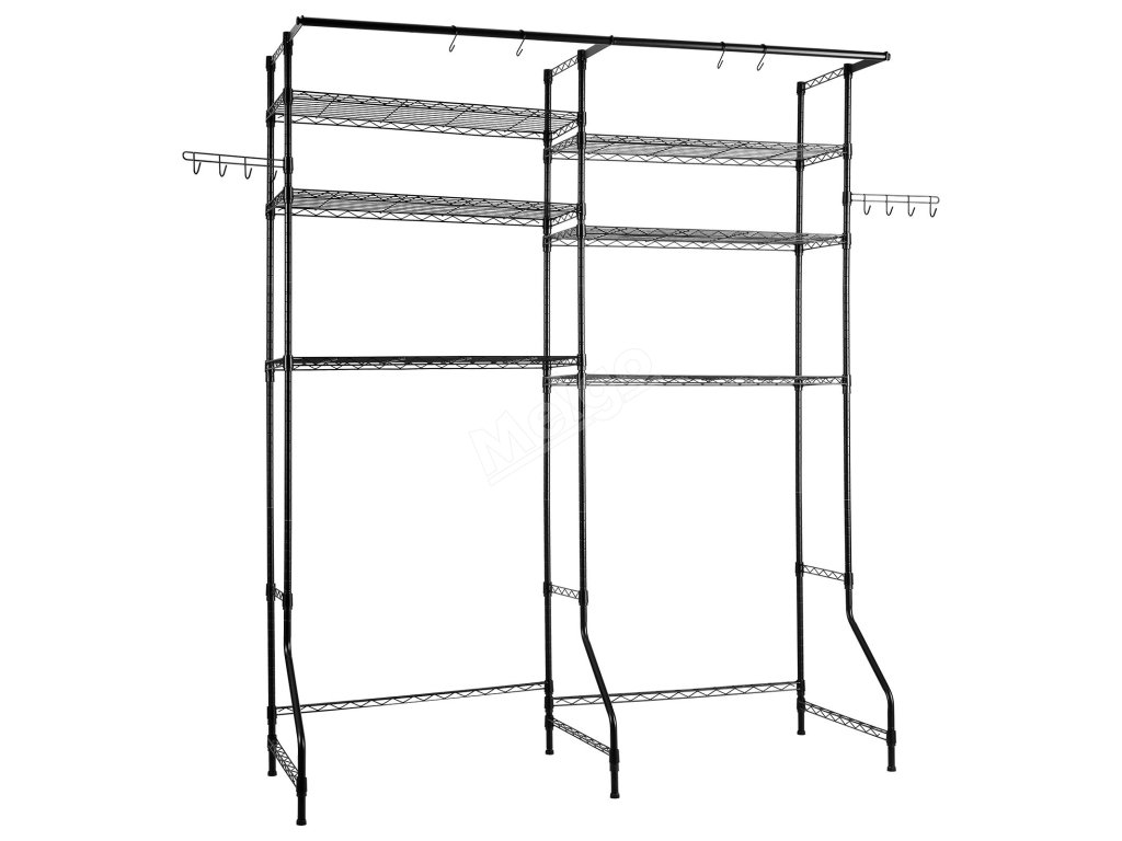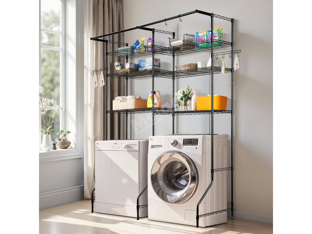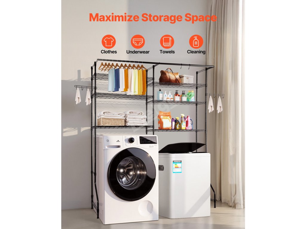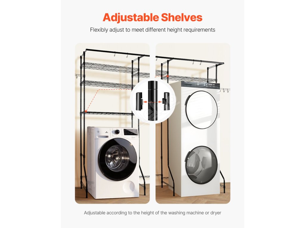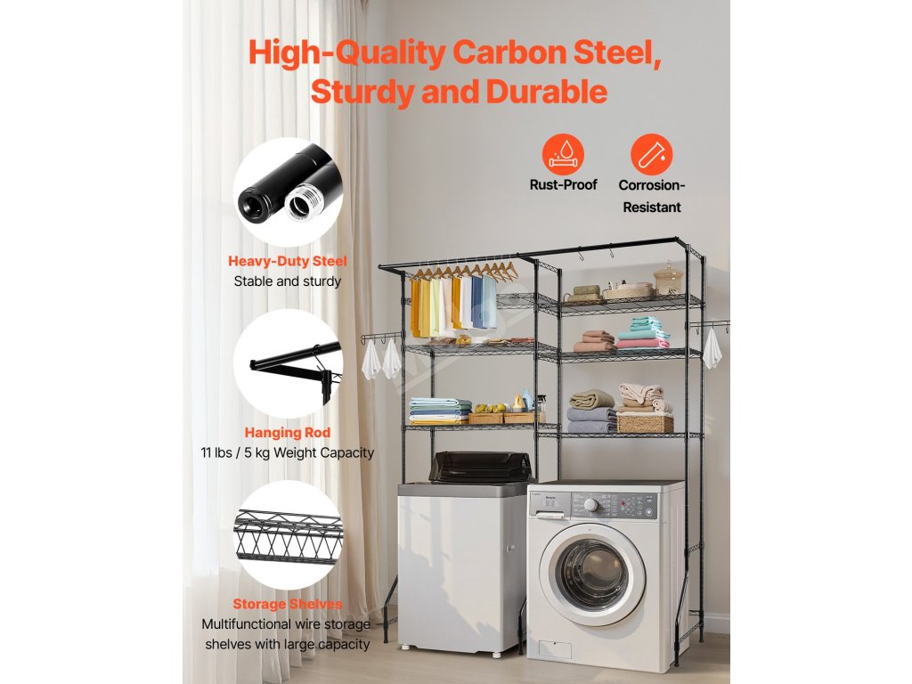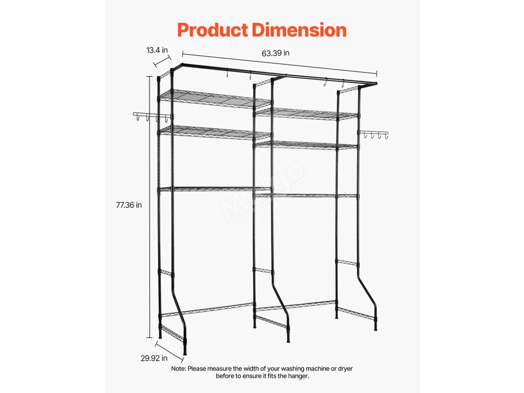Kompaktní a odolný stojan na pračku a sušičku Tento stojan na pračku a sušičku s nastavitelnými policemi, tyčemi a háčky je vhodný pro většinu praček. Je vyroben z odolné uhlíkové oceli odolné proti korozi, unese až 330,7 lbs/150 kg a je vybaven zařízením proti převrácení a snadnou instalací.