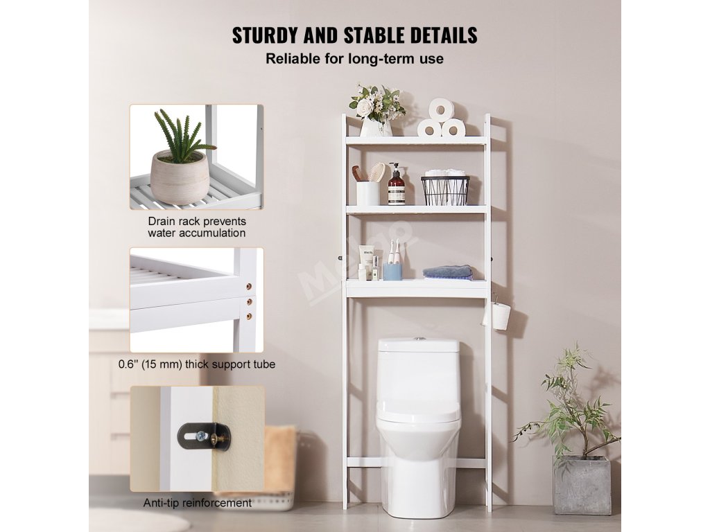 Přednastavená třístupňová nastavitelná výška prostřední police umožňuje, aby se lahve různé výšky, například prací prášek, snadno vešly do prostředního i spodního úložného prostoru, takže je tato odkládací police nad toaletou pohodlně přístupná.