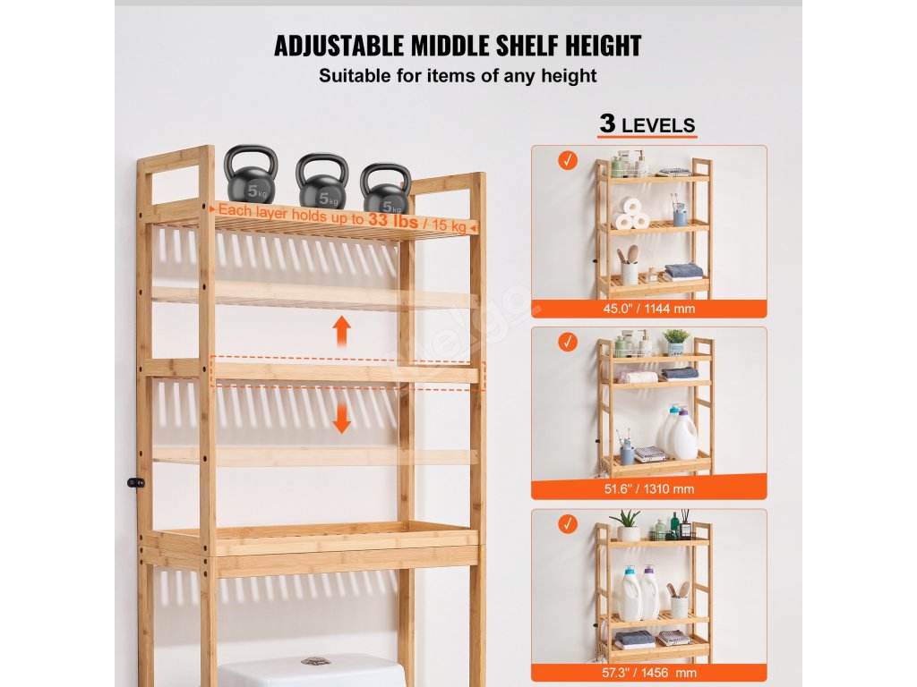 Přednastavená třístupňová nastavitelná výška prostřední police umožňuje, aby se lahve různé výšky, například prací prášek, snadno vešly do prostředního i spodního úložného prostoru, takže je tato odkládací police nad toaletou pohodlně přístupná.