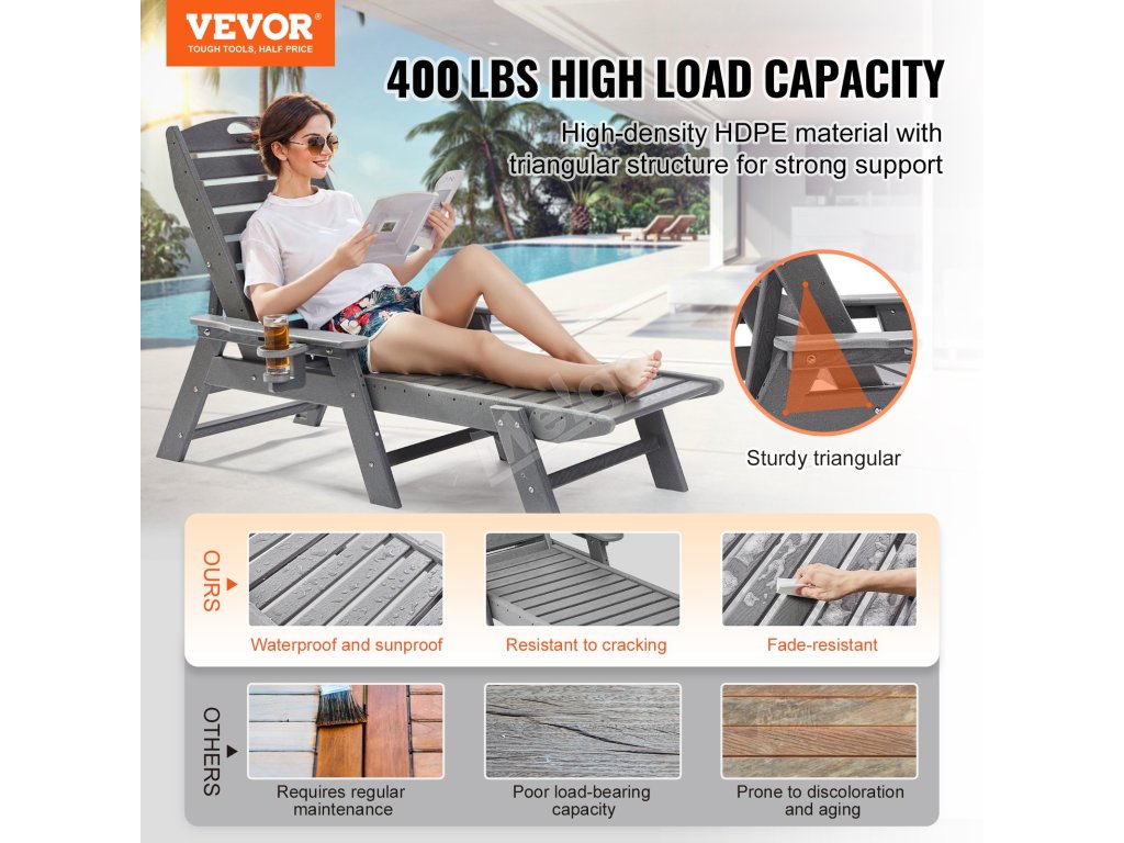 Toto lehátko je vyrobeno z odolného HDPE a odolá všem povětrnostním podmínkám, nevybledne ani nepraskne. Je ideální pro venkovní použití a stačí ho rychle otřít mýdlovou vodou, aby vypadalo skvěle.