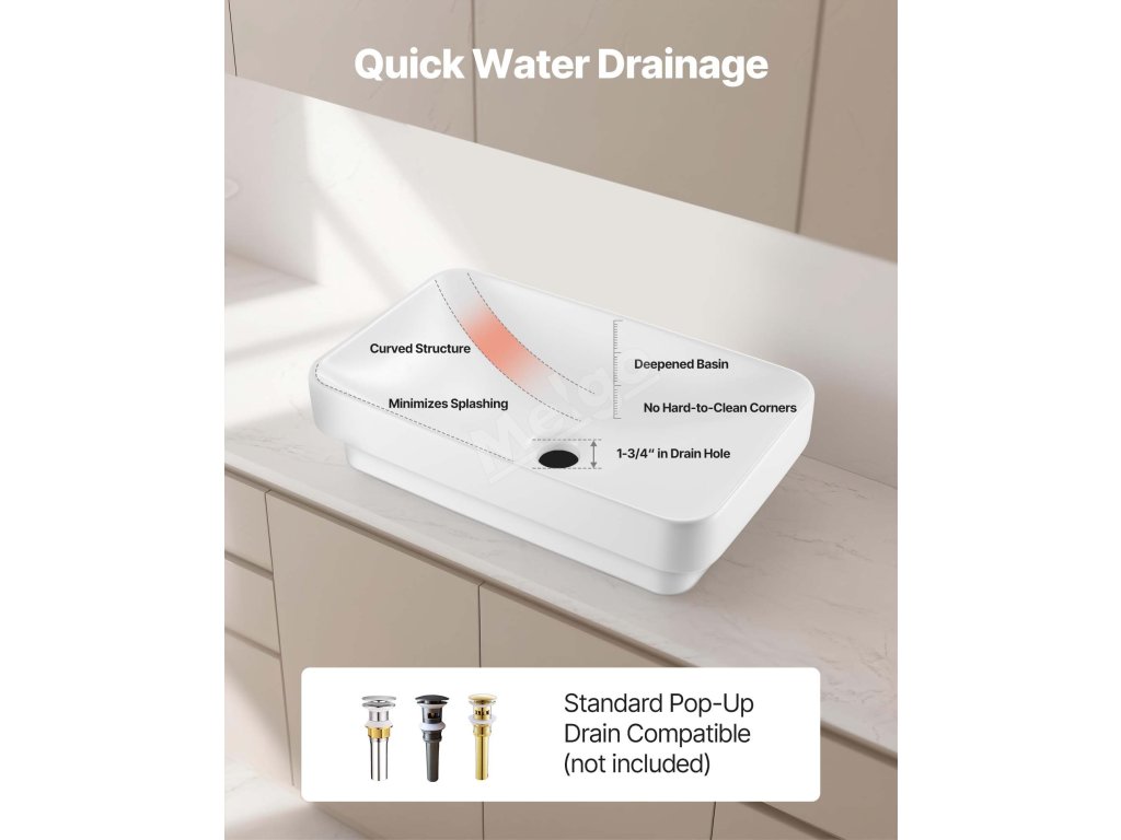 Naše koupelnové zapuštěné umyvadlo se vyznačuje stylovým a elegantním vzhledem, který dokonale zapadne do jakéhokoli prostoru - od kompaktních bytů a hotelů až po luxusní domy a nákupní centra. Dodejte mu nádech sofistikovanosti pro různé styly domácností.