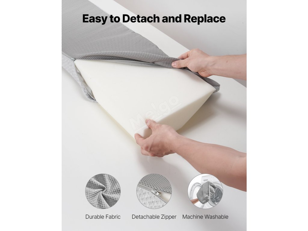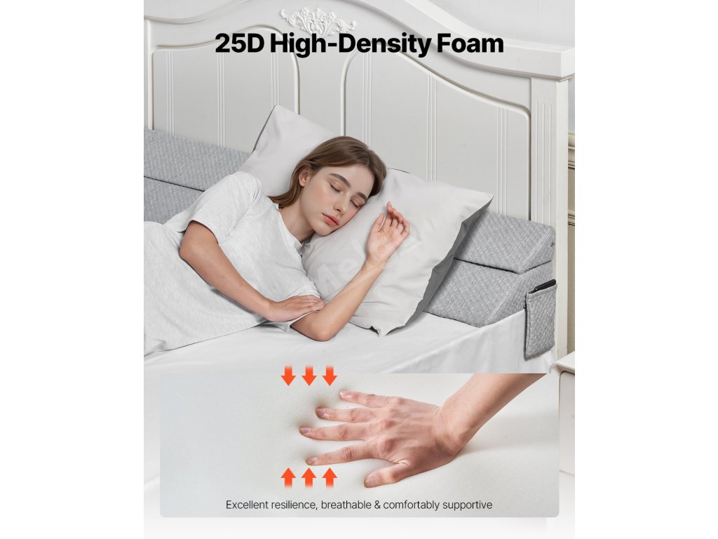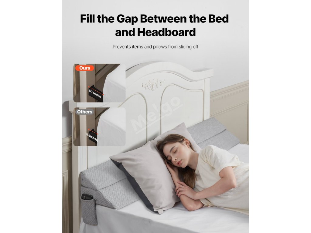 Naše výplň mezer v posteli je vyrobena z pěny o vysoké hustotě 25D, která poskytuje měkkou oporu a je prodyšná. Obsahuje velkou boční kapsu na telefon, brýle a dálkový ovladač. Odnímatelný povlak na polštář se snadno čistí a protiskluzové dno ho udrží na místě. Funkce překlopení se hodí k různým způsobům použití.