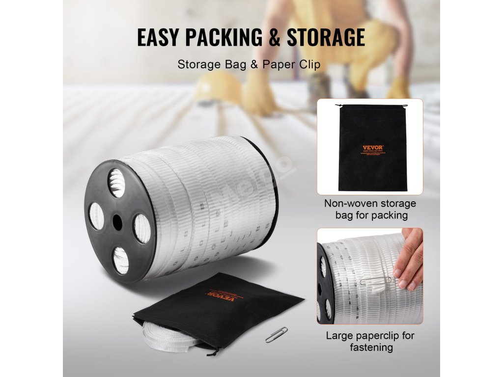 Postaráme se o vaše pohodlí! Polyesterová stahovací páska VEVOR je vybavena úložnou kapsou z netkané textilie pro snadnou organizaci použitých pásek a velkým uzávěrem ve tvaru přezky, který nepoužité pásky uchovává v bezpečí a přístupné.