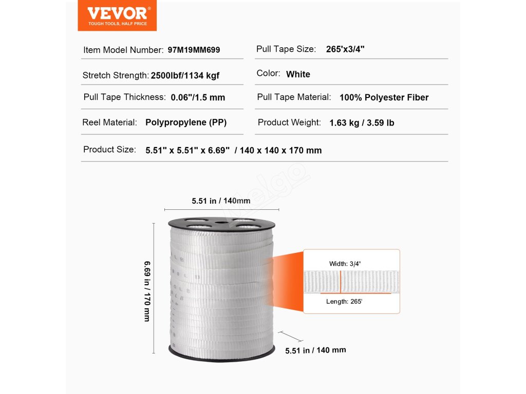 Plochá páska VEVOR z průmyslového polypropylenu (PP) zaručuje stabilitu a spolehlivost i při vysokých rychlostech. Její hladké vytažení v kombinaci s objímkou zaručuje špičkový výkon, který je ideální pro naléhavé situace při vedení kabelů.