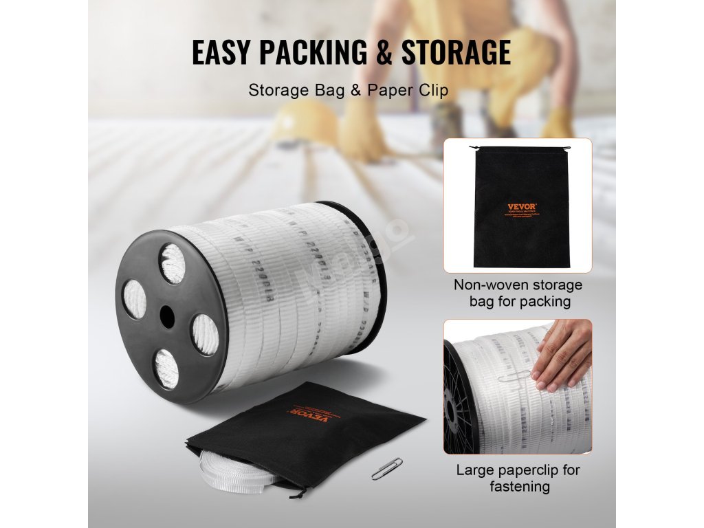 Postaráme se o vaše pohodlí! Polyesterová stahovací páska VEVOR je vybavena úložnou kapsou z netkané textilie pro snadnou organizaci použitých pásek a velkým uzávěrem ve tvaru přezky, který nepoužité pásky uchovává v bezpečí a přístupné.