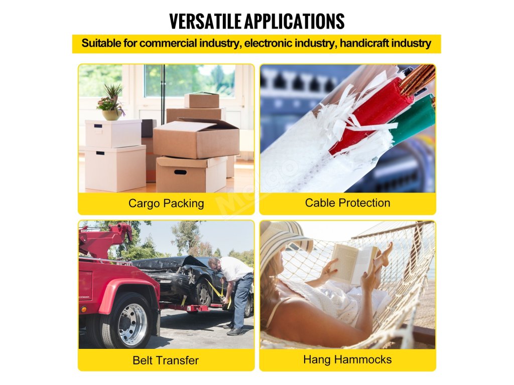 Polyesterová tahová páska se používá v široké škále aplikací, jako je balení podpěrných krabic, přeprava a nákladní doprava, upevňování ozubených kol. Ploché lano se používá především k ovíjení a ochraně kabelů nebo vodičů v průmyslu.