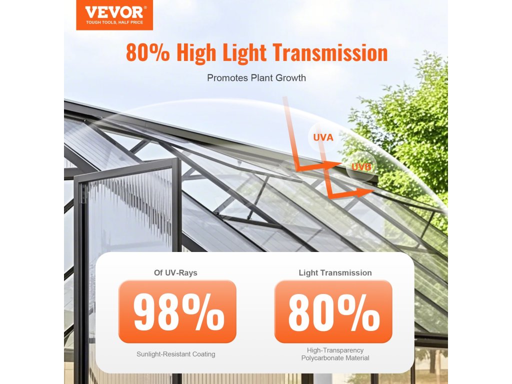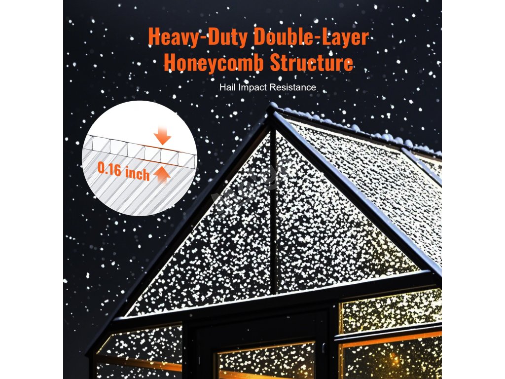 Vysoko priehľadný polykarbonát s UV ochranou poskytuje dostatok svetla, blokuje UV žiarenie a podporuje rast rastlín. Ľahko sa inštaluje, je prispôsobivý a energeticky účinný, poskytuje celoročnú izoláciu a bezpečnosť.