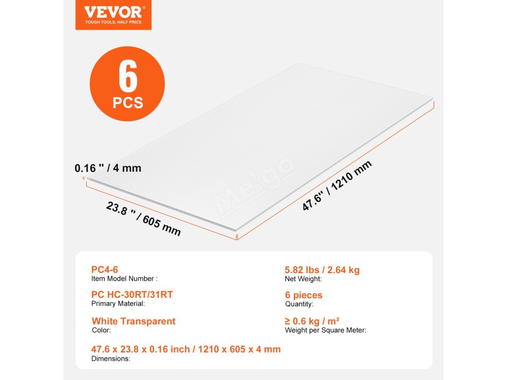 Polykarbonátové panely na skleník 6 ks 2'×4'×0.16'' průhledné odolné