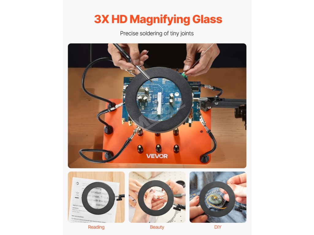 Náš pájecí asistent je vybaven 3x zvětšovací lupou, která poskytuje zvětšení s vysokým rozlišením a minimálním zkreslením a barevnými skvrnami, takže jemné detaily jsou přesnější a jasnější. Ideální pro přesné úkony, jako je pájení, opravy elektroniky a výroba šperků.