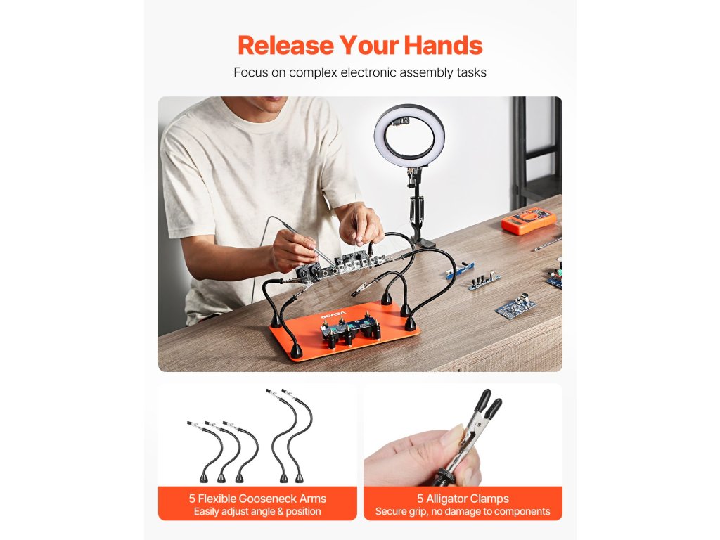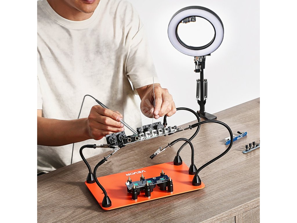 Naše pomocná pájecí ramena jsou vybavena 5 flexibilními rameny, která se mohou volně ohýbat o 360°, což umožňuje snadné nastavení úhlu a výšky pro přesné umístění dílů. Jsou ideální pro projekty jakékoli velikosti, zcela vám uvolní ruce a zefektivní práci.