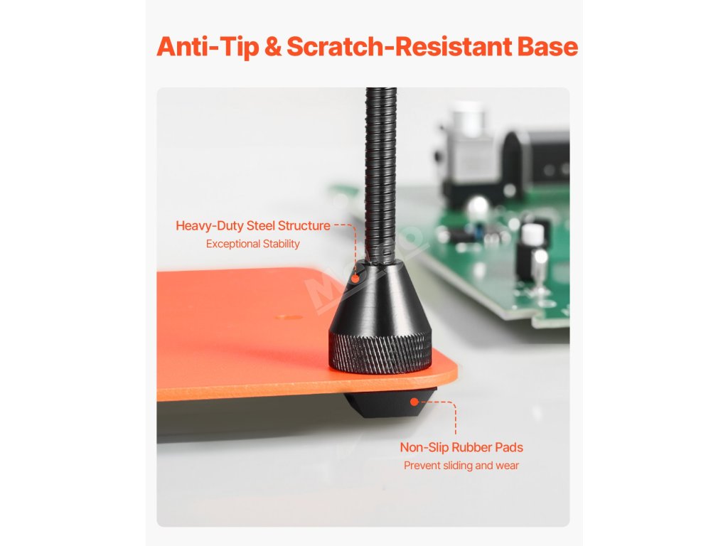 Odolná ocelová základna s protiskluzovými gumovými podložkami udrží sestavu pevně na místě a zabrání jejímu sklouznutí a převrácení. To také zabraňuje poškrábání pracovní plochy a poskytuje pevnou a bezpečnou základnu pro přesné pájení.