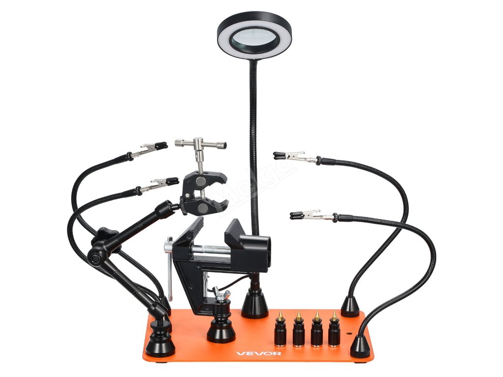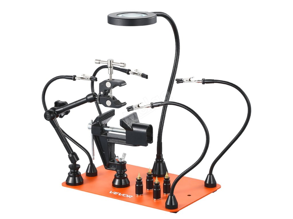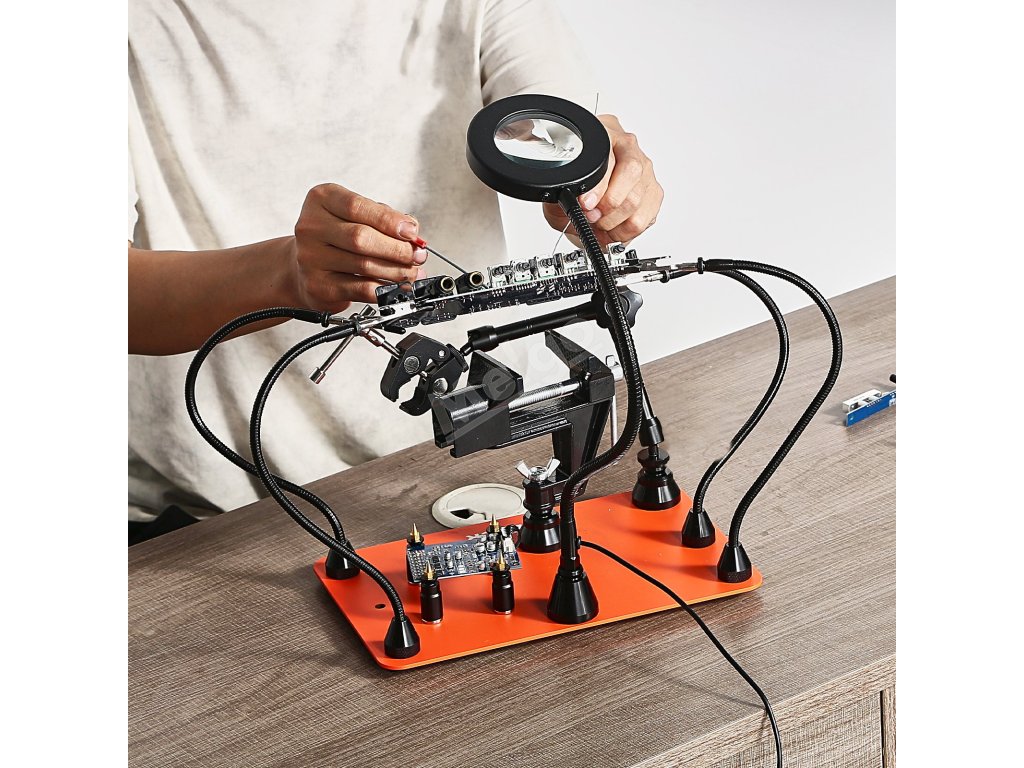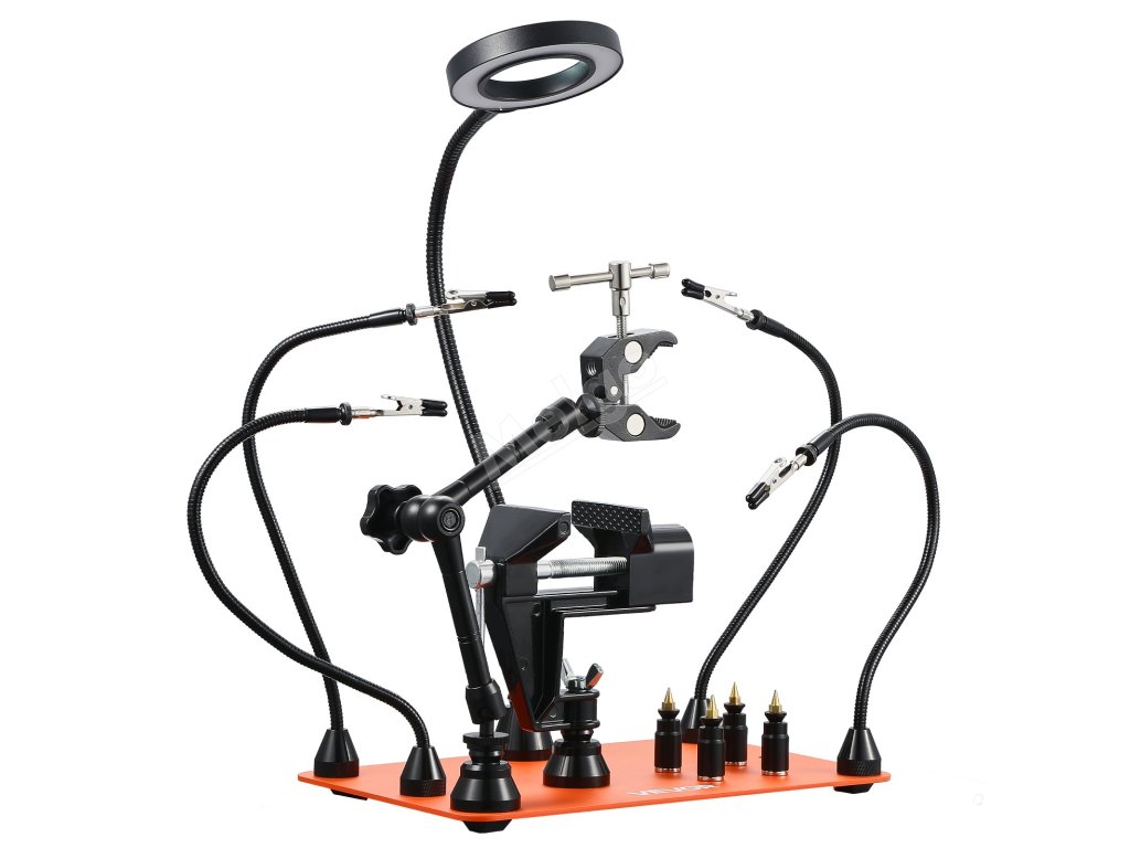 Pomocník při pájení 4 ramena, svěrák, 3× led lupa, 360° držák