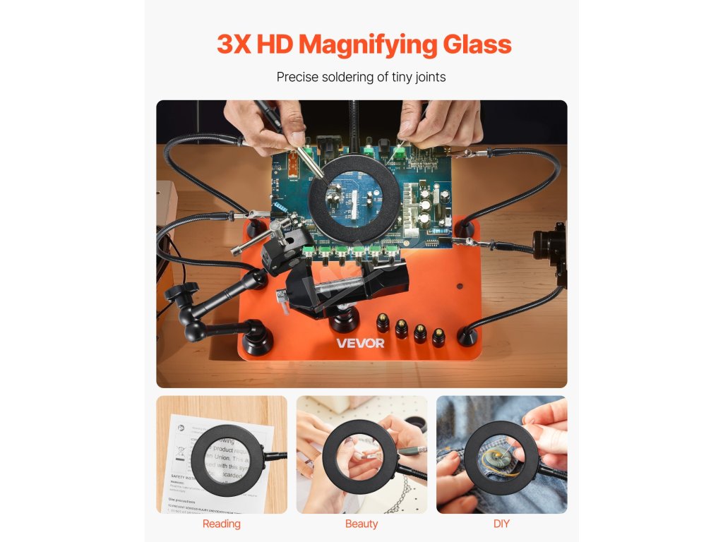 Náš pájecí asistent je vybaven 3x zvětšovací lupou, která poskytuje zvětšení s vysokým rozlišením a minimálním zkreslením a barevnými skvrnami, takže jemné detaily jsou přesnější a jasnější. Ideální pro přesné úkony, jako je pájení, opravy elektroniky a výroba šperků.