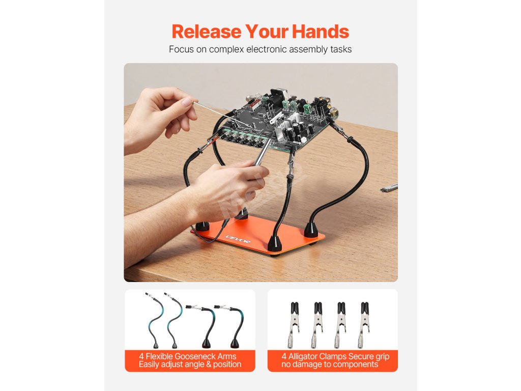 Naše pomocná pájecí ramena mají 4 flexibilní ramena, která se mohou volně ohýbat o 360°, což umožňuje snadné nastavení úhlu a výšky pro přesné umístění dílů. Jsou ideální pro projekty jakékoli velikosti, zcela vám uvolní ruce a zefektivní práci.