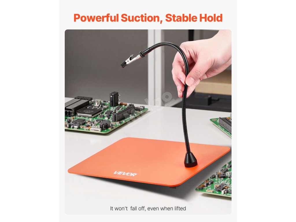 Základna ramene s husím krkem je vybavena silnou magnetickou přitažlivostí, která ji bezpečně připevní k pracovní ploše. Toto nářadí s pomocnými rameny tak zabraňuje posunu při práci, snižuje riziko sklouznutí nebo převrácení nářadí a umožňuje rychlé nastavení, čímž zvyšuje efektivitu práce.