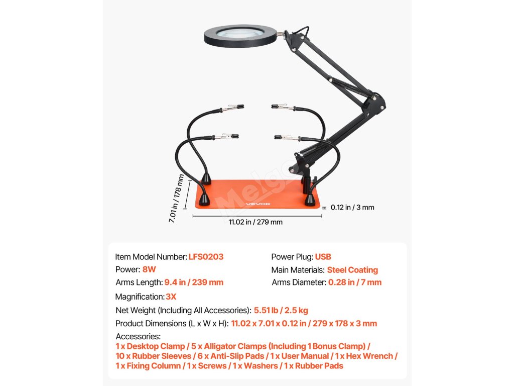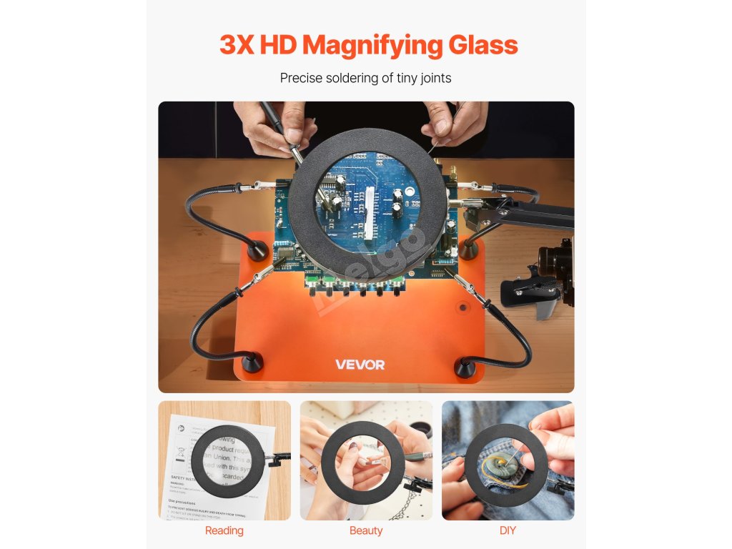 Náš pájecí asistent je vybaven 3x zvětšovací lupou, která poskytuje zvětšení s vysokým rozlišením a minimálním zkreslením a barevnými skvrnami, takže jemné detaily jsou přesnější a jasnější. Ideální pro přesné úkony, jako je pájení, opravy elektroniky a výroba šperků.
