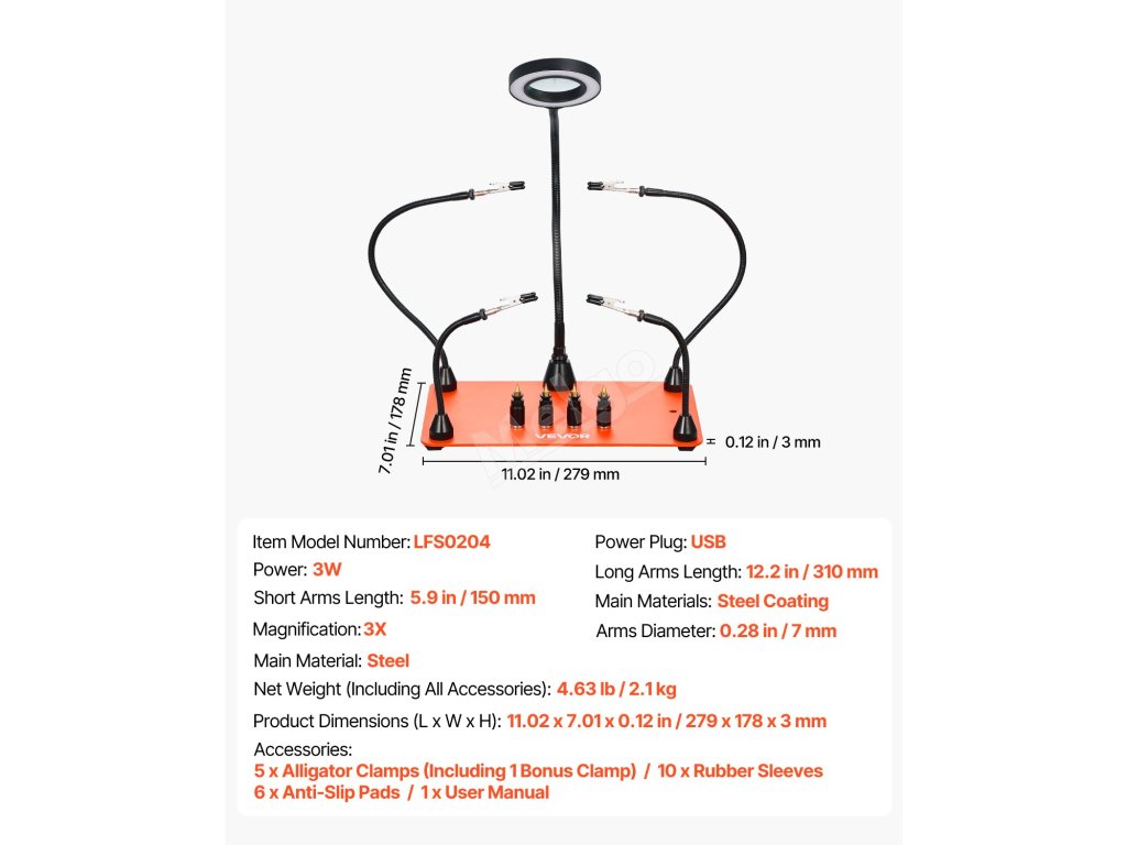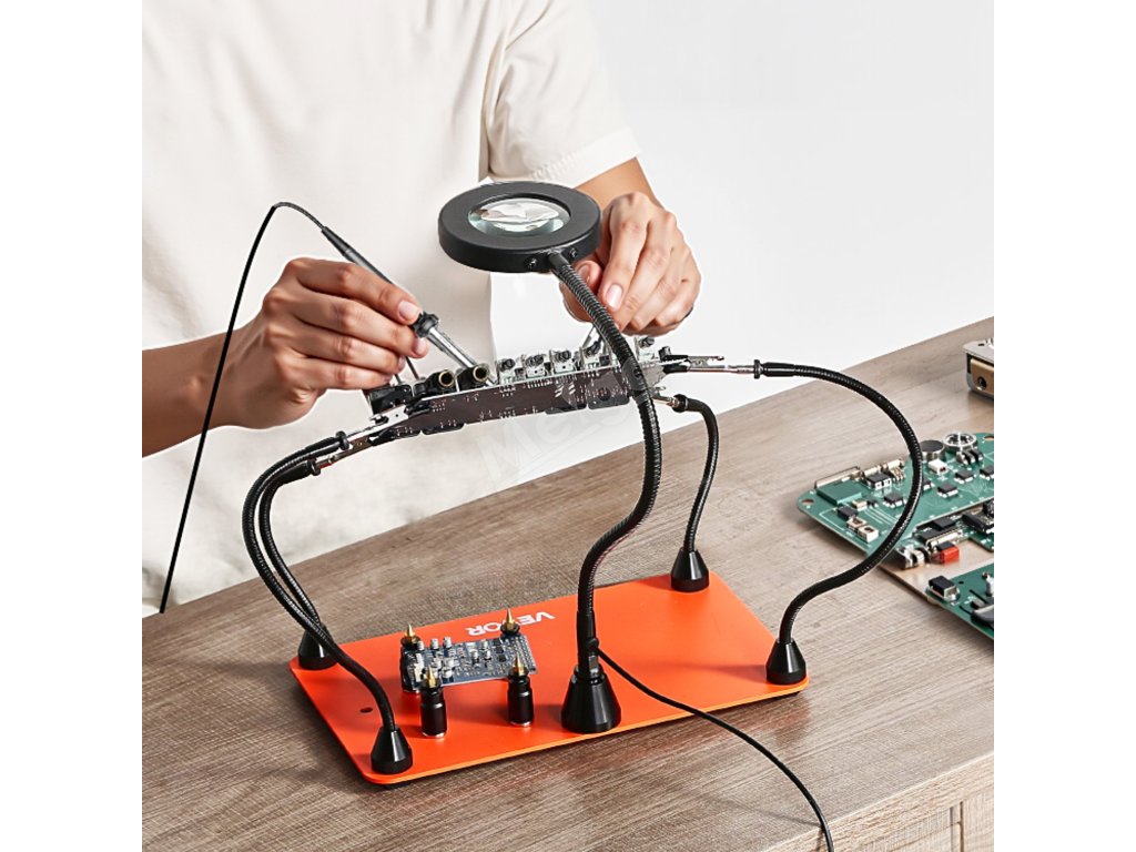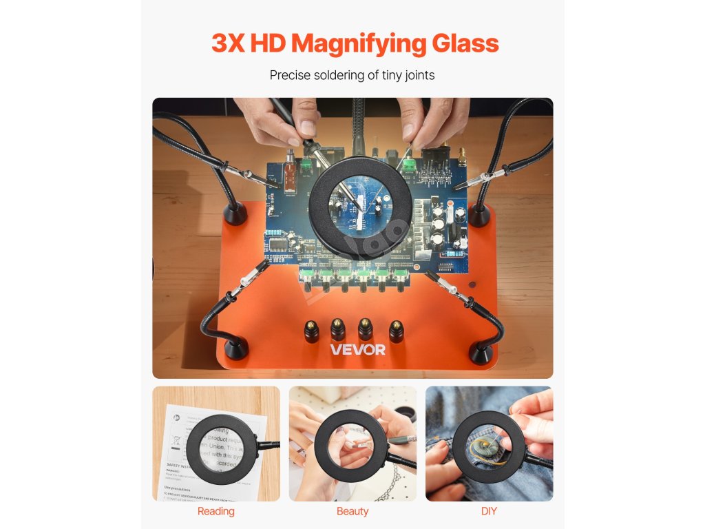 Náš pájecí asistent je vybaven 3x zvětšovací lupou, která poskytuje zvětšení s vysokým rozlišením a minimálním zkreslením a barevnými skvrnami, takže jemné detaily jsou přesnější a jasnější. Ideální pro přesné úkony, jako je pájení, opravy elektroniky a výroba šperků.