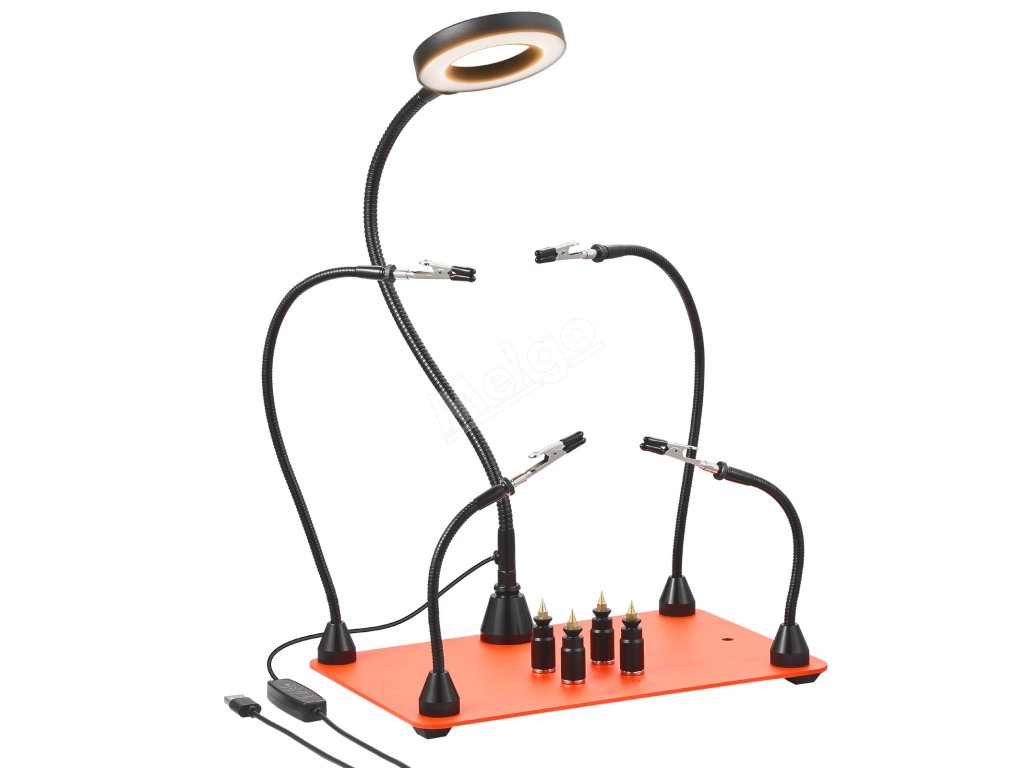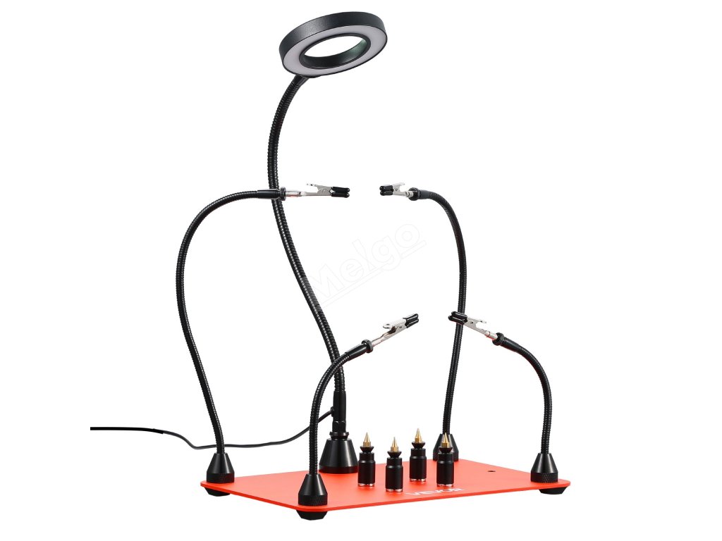 Pomocný pájecí stojan s 3× led lupou, 4 ramínka, 4 držáky, základna