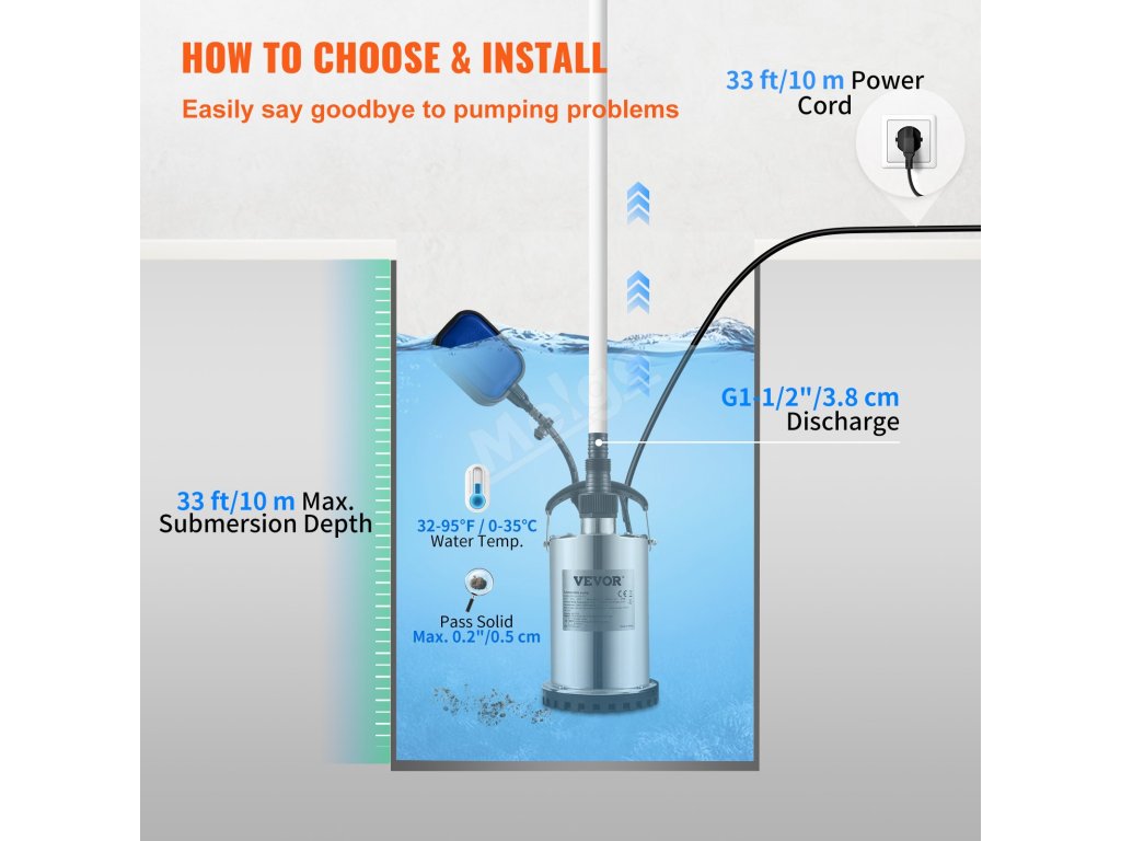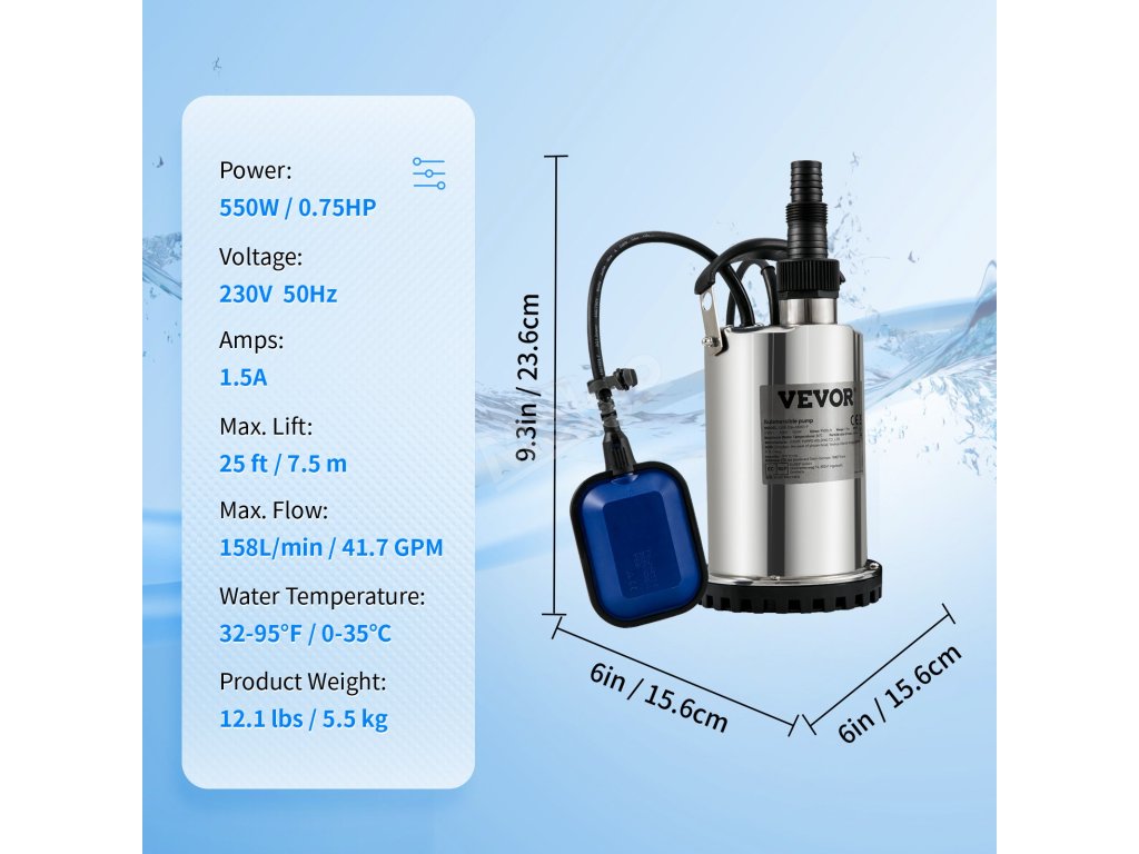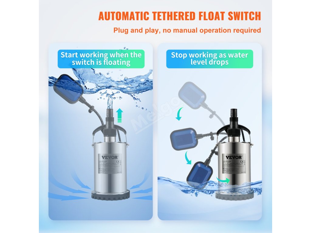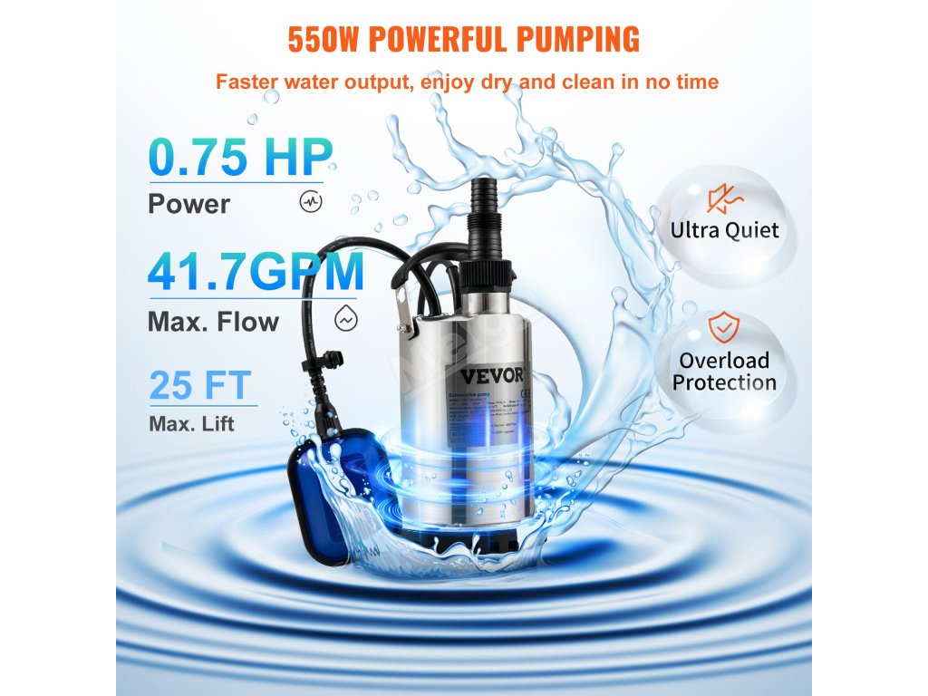 Díky výkonnému měděnému motoru o výkonu 0,75 HP si naše ponorné vodní čerpadlo zachovává dlouhotrvající rychlý odvodňovací výkon. Je vybaveno tepelnou ochranou proti přetížení a nízkou hlučností při provozu.
